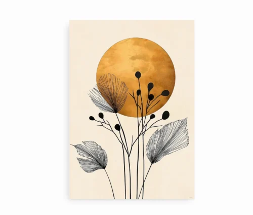 Denne smukke botaniske plakat forener det naturlige og det grafiske i ét harmonisk motiv. Med fine sorte planteillustrationer og en varm, gylden sol i baggrunden udstråler værket en rolig og stilfuld æstetik, der passer ind i ethvert moderne hjem.