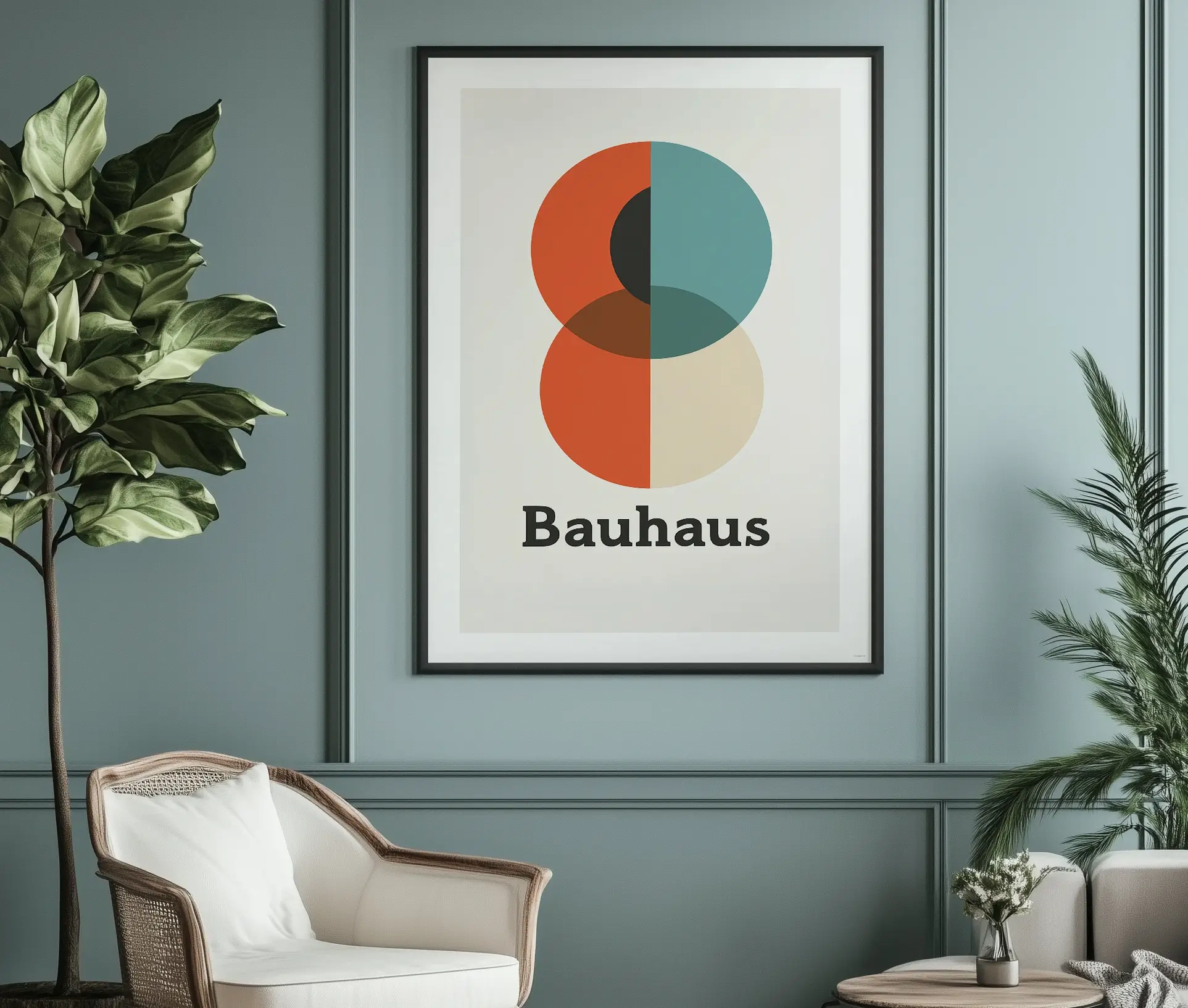 Oplev tidløs designæstetik med denne stilrene Bauhaus plakat, der forener enkelhed, funktion og form i et markant geometrisk udtryk. Med to overlappende cirkler i varme nuancer af rød, blå, sort og beige samt et klart typografisk “Bauhaus”-tryk, er plakaten en ægte hyldest til den legendariske tyske designskole, der revolutionerede arkitektur, kunst og grafisk design.