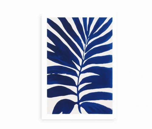 Denne grafiske plakat med palmeblad i en dyb blå farve bringer naturens elegance ind i hjemmet på minimalistisk vis. Med sit enkle, men markante udtryk passer den perfekt til den moderne og stilrene indretning. Det håndmalede udtryk og den klare blå farve skaber et smukt visuelt fokuspunkt – uanset om plakaten hænger alene eller indgår i en billedvæg.