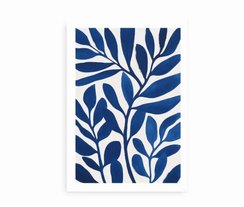 Denne plakat forener enkelhed med naturens organiske former i et stærkt visuelt udtryk. De håndmalede blade i en dyb kongeblå farve snor sig elegant hen over en ren, hvid baggrund. Hvilket skaber et moderne botanisk udtryk med masser af ro og balance.
