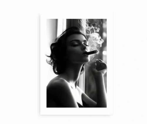 Denne smukke sort-hvide plakat udstråler tidløs elegance og mystik. Motivet viser en sofistikeret kvinde, der nydelsesfuldt ryger en cigar, mens røgsløret danser i luften. Den dramatiske lys-skygge-effekt giver billedet dybde og et filmisk udtryk, der tilfører rummet en eksklusiv atmosfære.