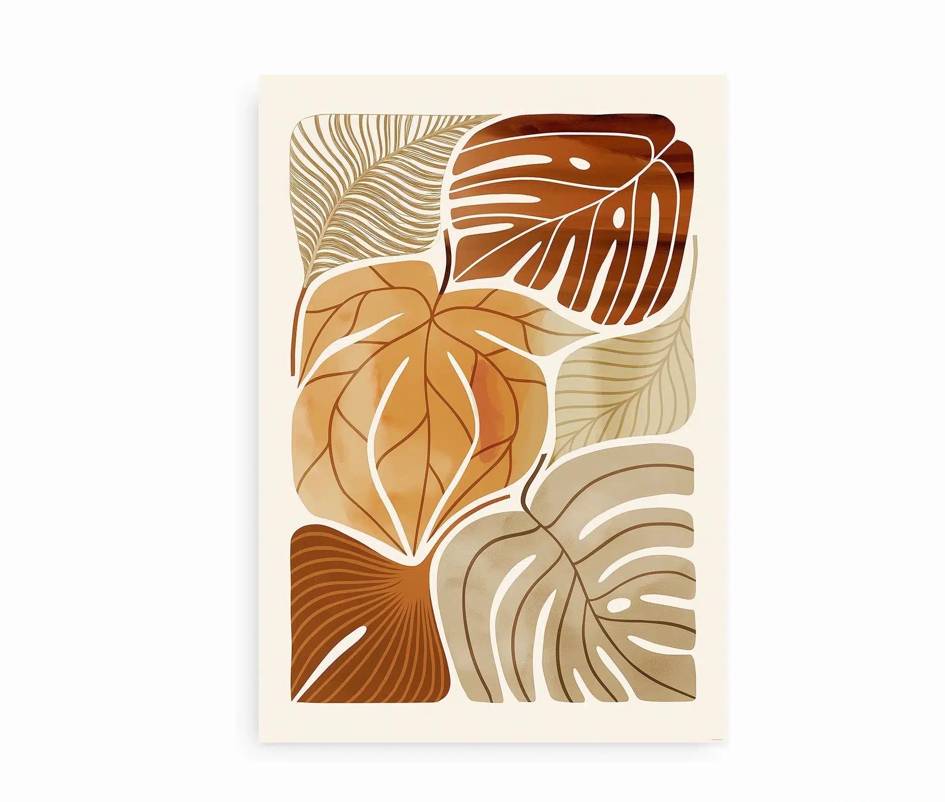 Motivet viser stiliserede blade i nuancer af beige, karamel og brændt sienna, arrangeret i en harmonisk komposition. De bløde linjer og afdæmpede farver skaber et roligt og indbydende udtryk.