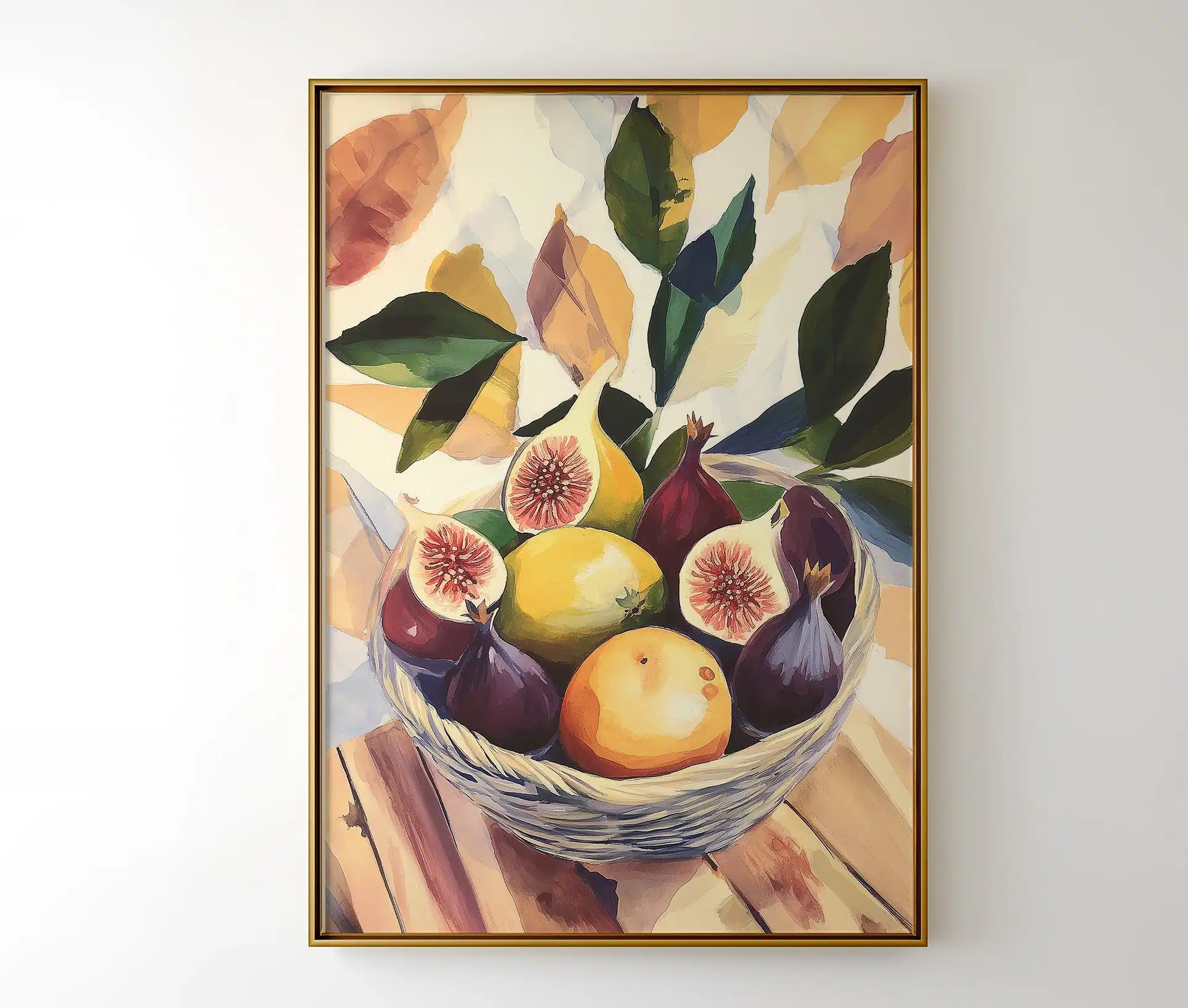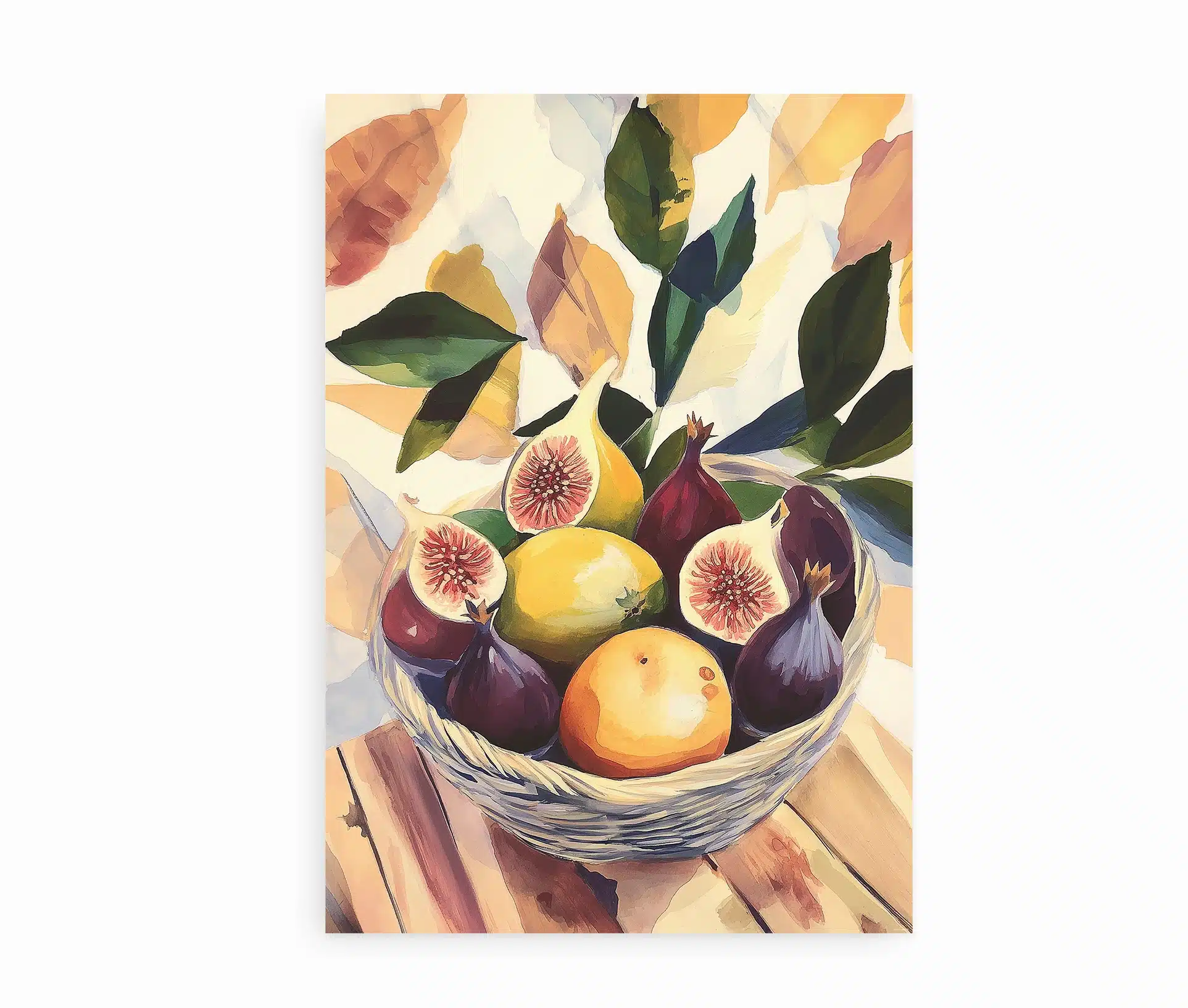 Bowl of Figs er en moderne kunstplakat inspireret af klassisk stilleben-maling. Motivet viser en fletkurv med modne figner, citroner og appelsiner – malet i varme, solrige nuancer, der bringer følelsen af sensommer og middelhavsstemning ind i hjemmet.
