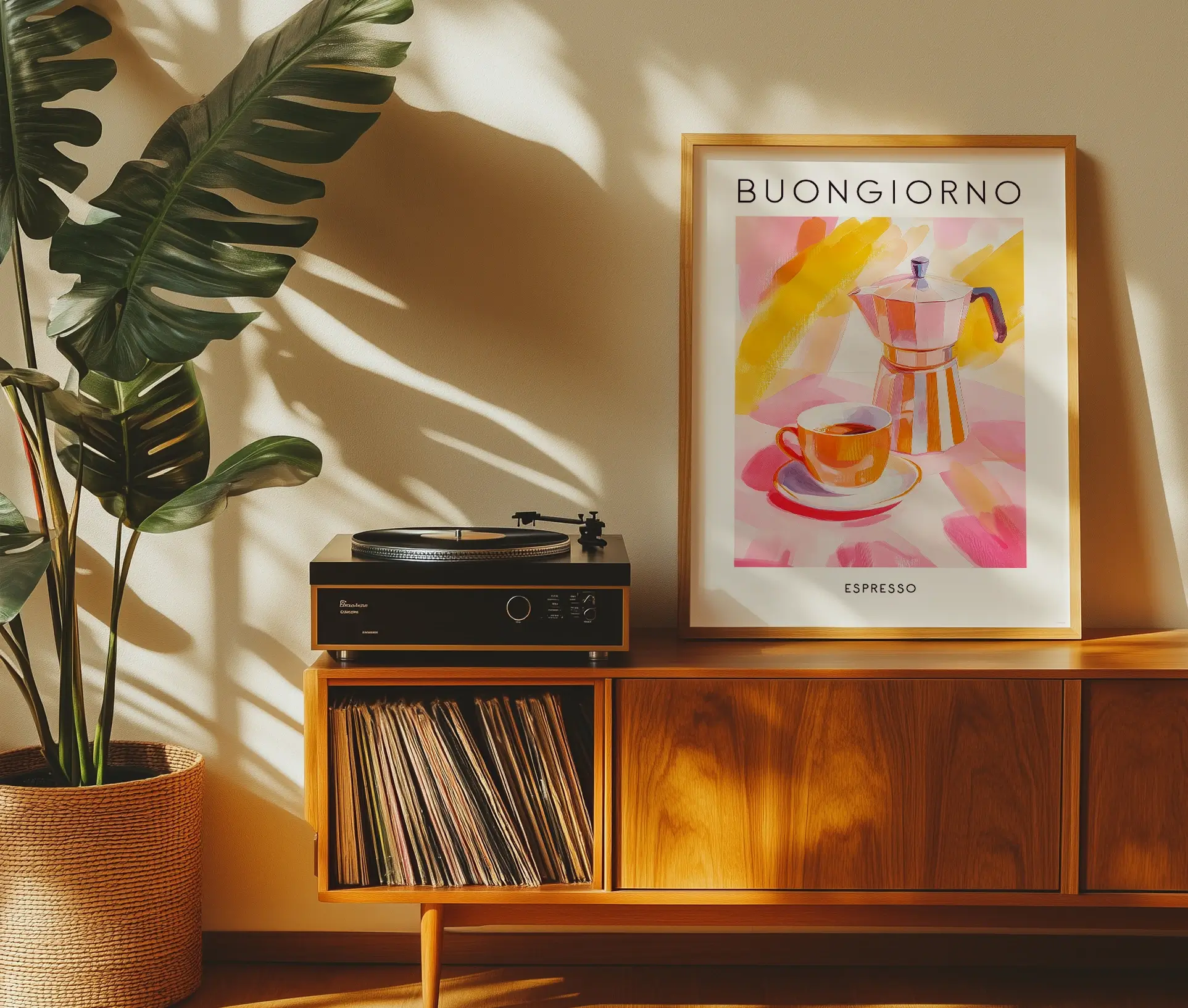 Motivet fanger essensen af en hyggelig morgenstund med en skøn blanding af lyserøde, gule og orange nuancer, der giver et livligt og kunstnerisk udtryk. Med teksten “Buongiorno” øverst og “Espresso” nederst får plakaten et stilrent og moderne look, der passer perfekt ind i både minimalistiske og farverige indretninger.