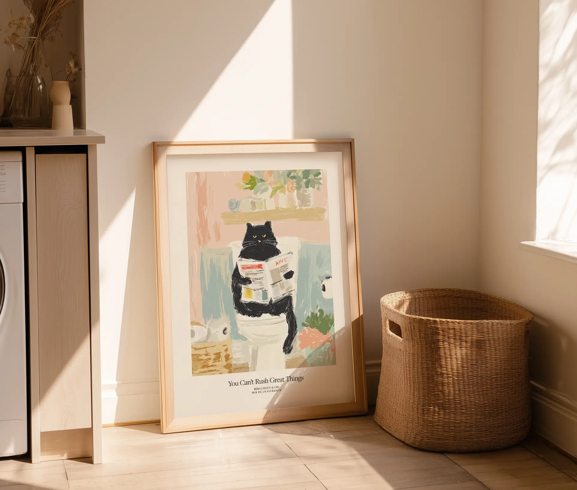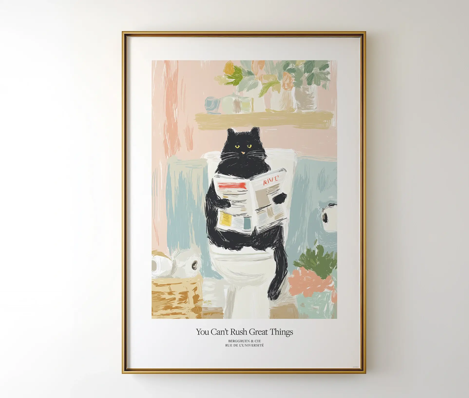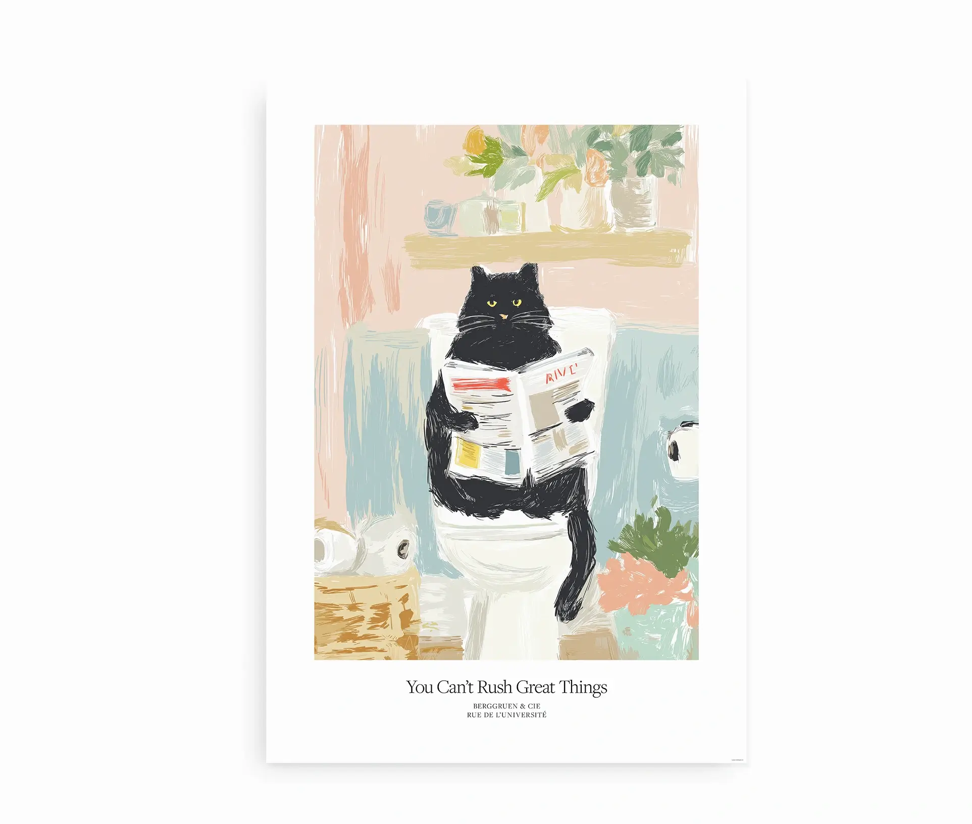 Can’t Rush Great Things plakaten er en humoristisk og charmerende illustration. Der kombinerer legende kunst med hverdagens små øjeblikke. Motivet viser en sort kat, der sidder afslappet på toilettet med en avis i hænderne. Omgivet af rolige pastelfarver og detaljer som blomster, kurv med toiletpapir og en afslappet stemning. Humoren i teksten understreger billedets sjove og afslappede tone. Som både får smilet frem og skaber en hyggelig stemning i hjemmet.