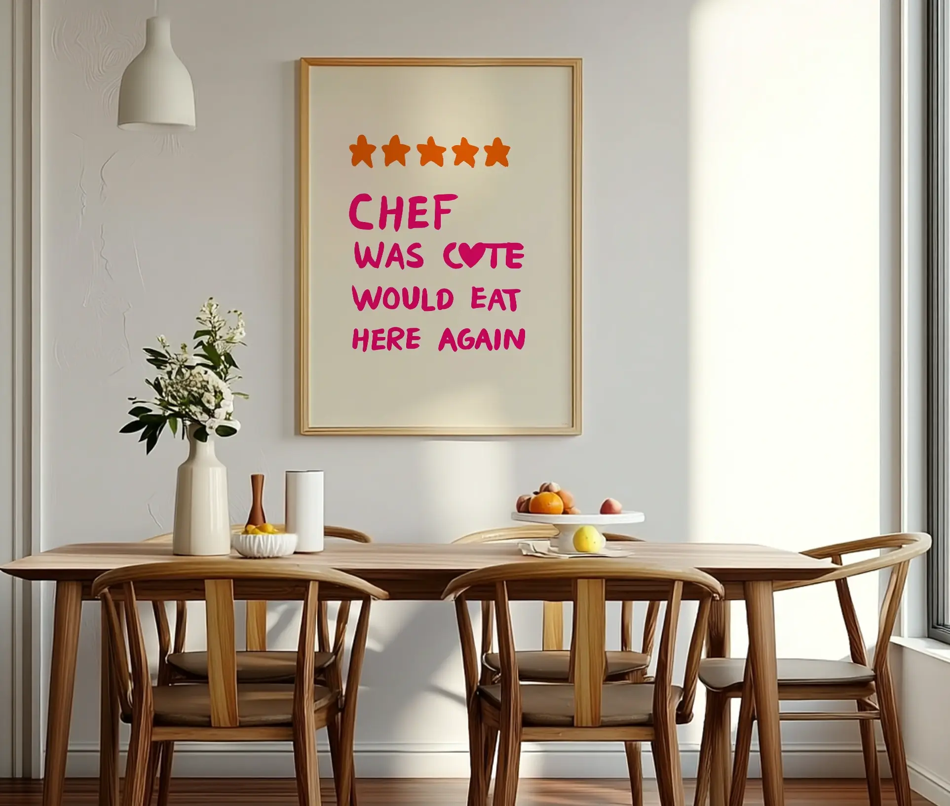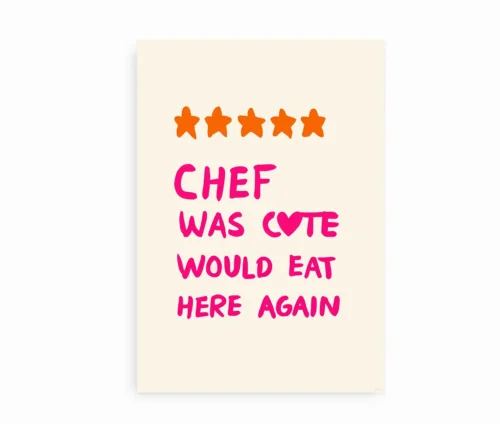 Denne sjove og charmerende køkkenplakat er en sand samtalestarter. Med fem orange stjerner og teksten “Chef was cute – would eat here again” skrevet i iøjnefaldende pink og med et hjerteformet ‘O’, rammer plakaten plet hos alle, der elsker mad, kærlighed og humor i køkkenet. Den balancerer sødme og selvironi og tilføjer et moderne, personligt twist til ethvert spiseområde.