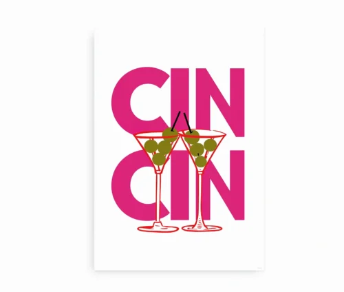 Det italienske udtryk “Cin Cin” bruges, når man skåler. Og netop den uhøjtidelige glæde og invitation til socialt samvær rammer denne plakat lige i skabet. De enkle linjer og stærke farver gør den nem at kombinere med både moderne og retro-inspireret boligindretning.