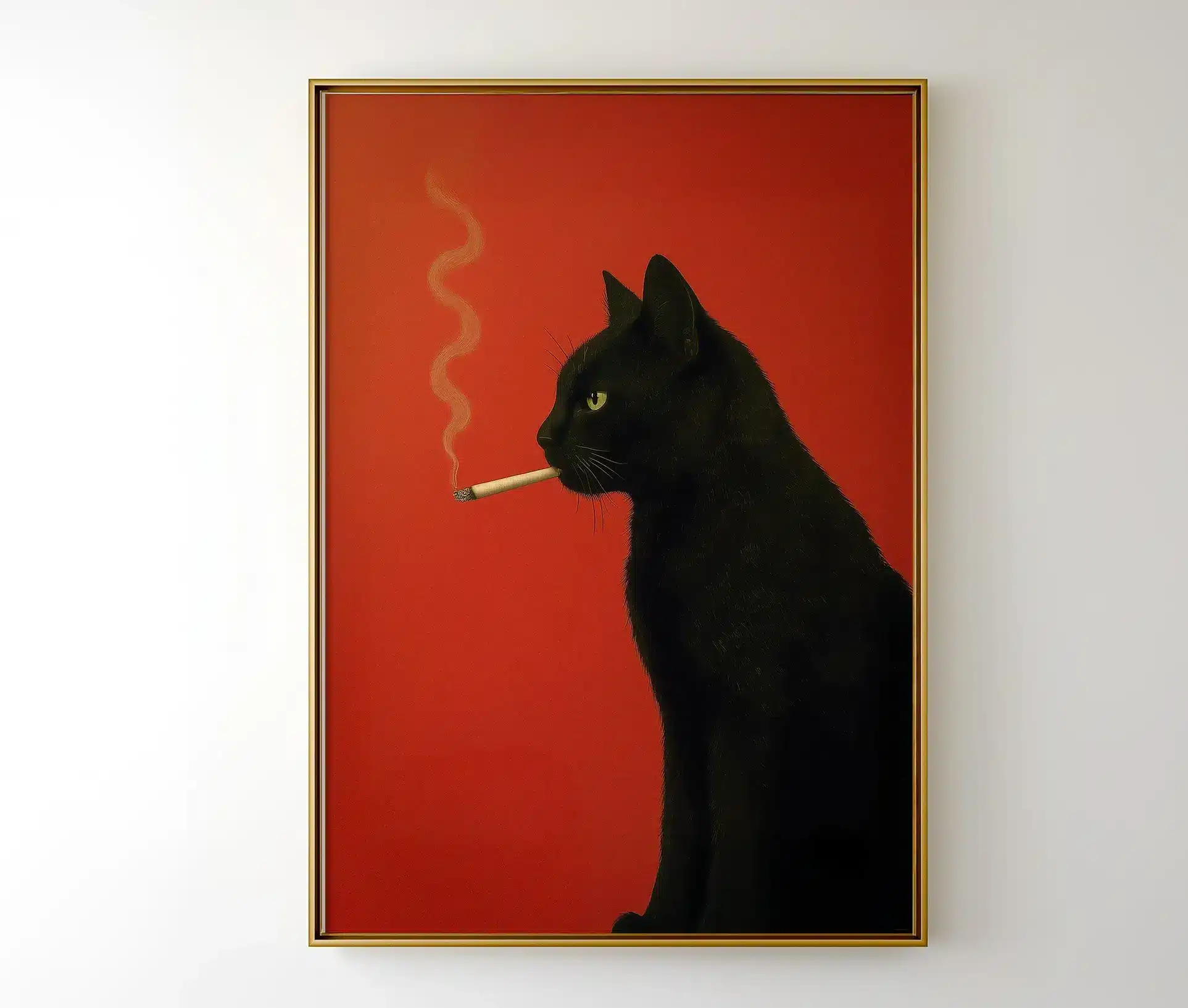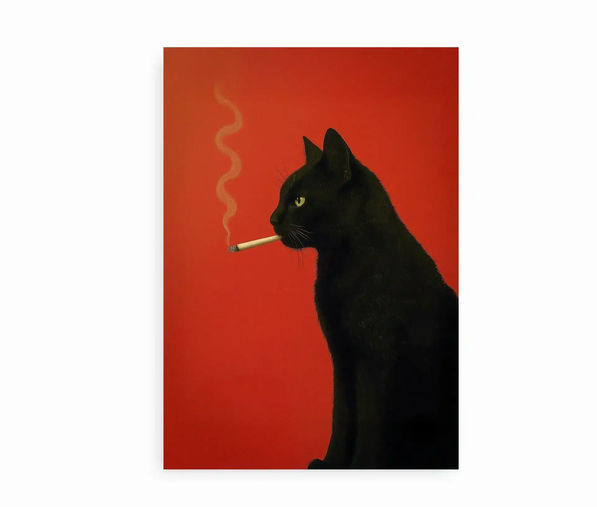 Denne plakat med titlen “Cool Cat” kombinerer humor, attitude og grafisk elegance i ét fængende kunstværk. Den sorte kat, der kigger ud i rummet med en cigaret i munden, udstråler nonchalant coolness og et strejf af mystik. Baggrunden i en intens rød nuance forstærker det dristige udtryk og skaber en kontrast, der fanger øjet med det samme.