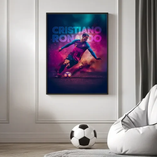 Denne plakat hylder Cristiano Ronaldo, en af de mest ikoniske fodboldspillere nogensinde, med et dynamisk og kraftfuldt motiv.