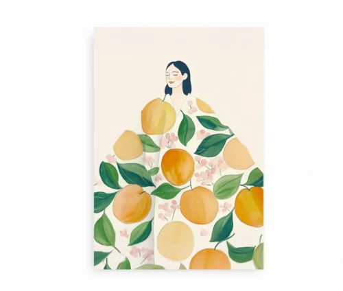 Denne plakat med titlen Mademoiselle Abricot er et kunstnerisk udtryk, der kombinerer elegance og legende farver. Motivet forestiller en dame med et roligt, tilfreds udtryk, klædt i en jakke dækket af store, saftige abrikoser, grønne blade og små lyserøde blomster. Den stiliserede illustration bringer en lethed og glæde ind i rummet, samtidig med at de varme farvetoner skaber en harmonisk balance mellem det livlige og det rolige.