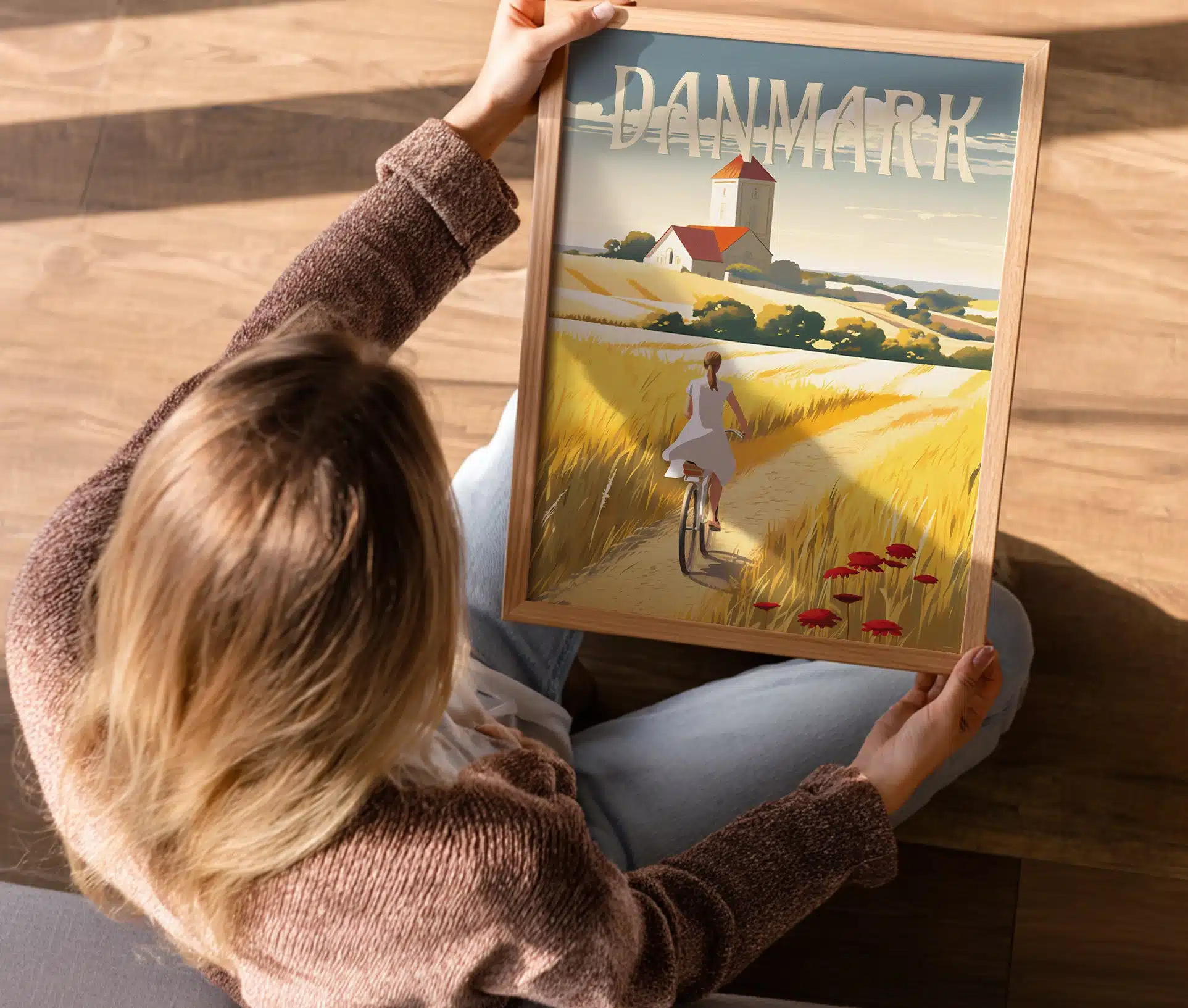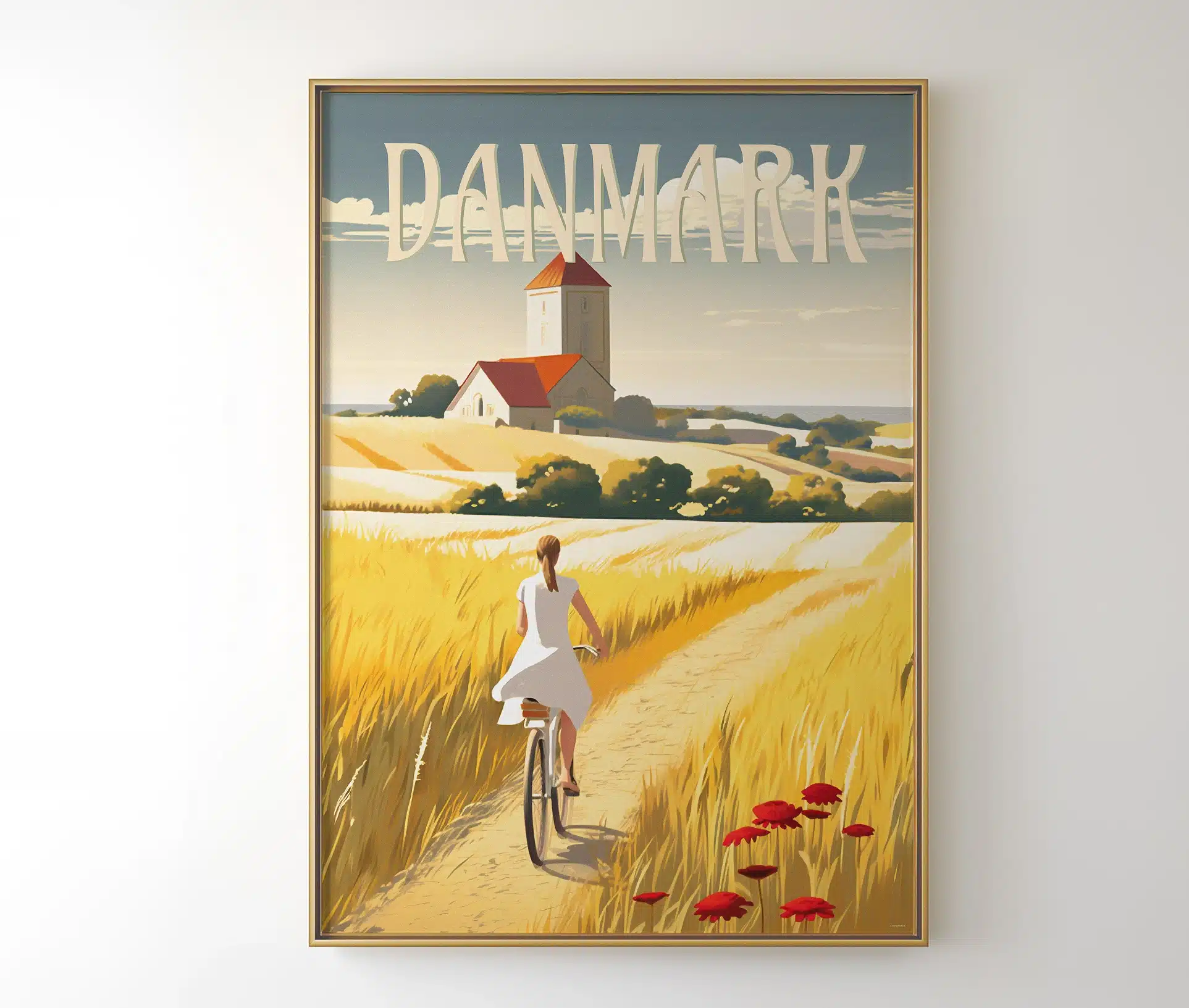 Motivet fanger essensen af det danske sommerlandskab med en kvinde på cykel, der triller ned ad en markvej omgivet af gyldne kornmarker. I horisonten rejser en majestætisk kirke sig, og markvejen er prydet med sommerens første valmuer. Denne plakat er en hyldest til Danmarks naturskønhed og er perfekt til alle, der ønsker at tilføje et strejf af dansk charme til deres hjem.