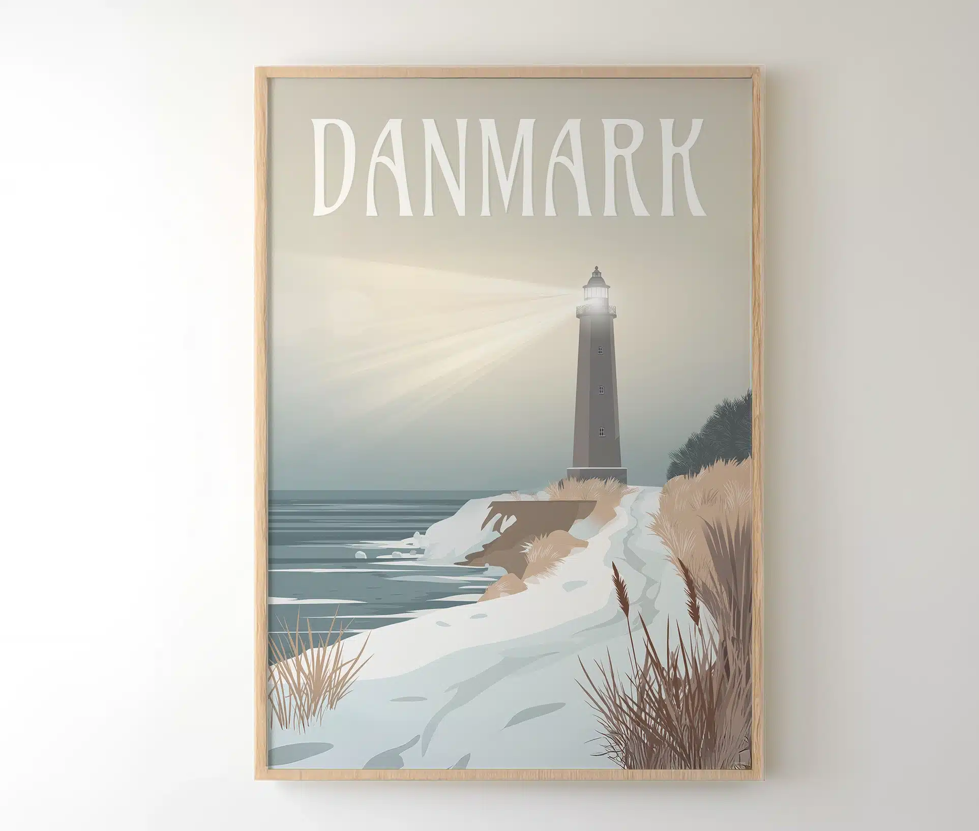 Danmark – Strand med fyrtårn kan stå alene som et markant, men afdæmpet blikfang, eller kombineres med andre Danmark-plakater for at skabe en sammenhængende billedvæg med nordisk tema. Plakaten er trykt på kvalitetspapir med mat finish, så detaljerne fremstår klare, og farverne bevarer deres bløde dybde.