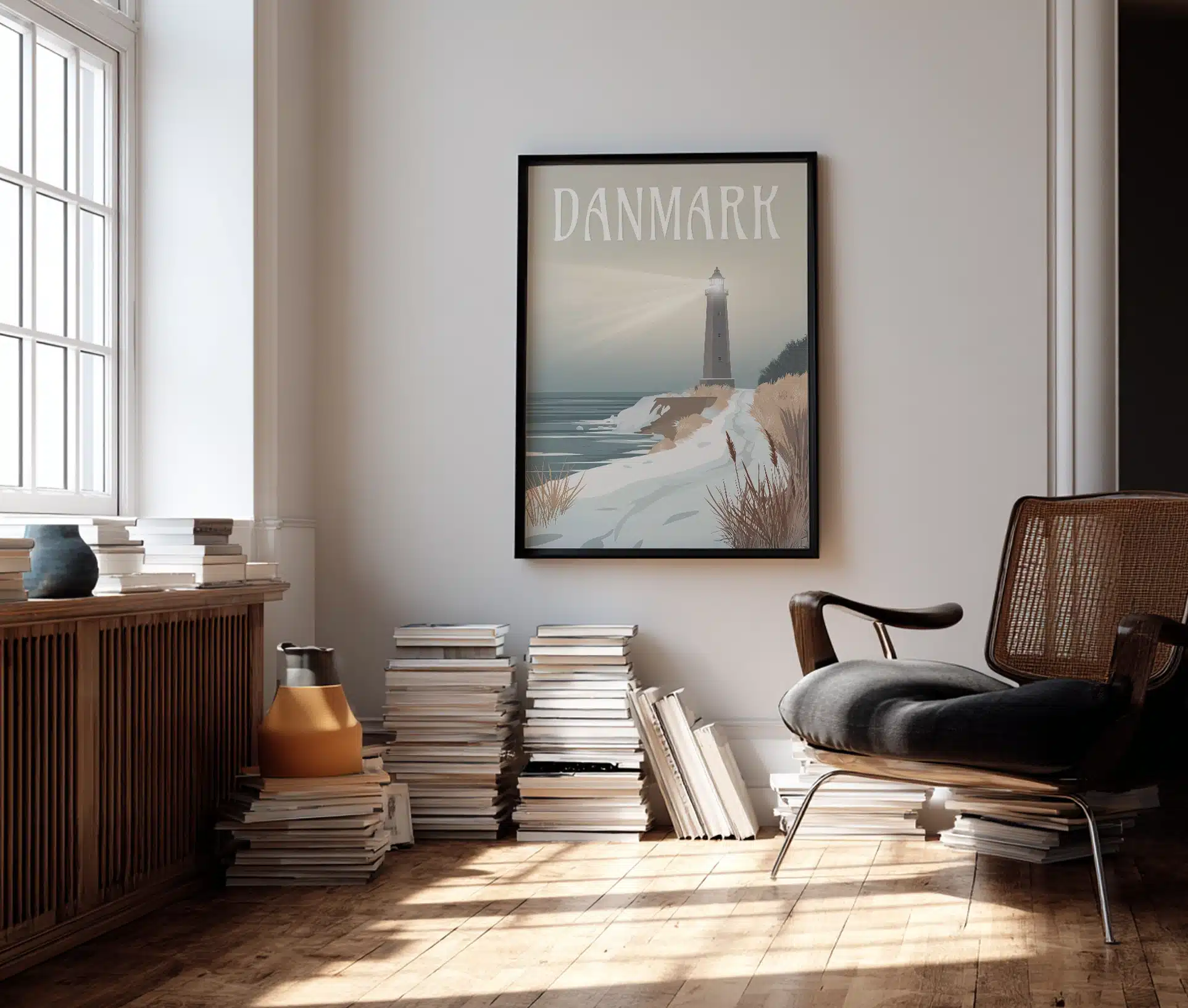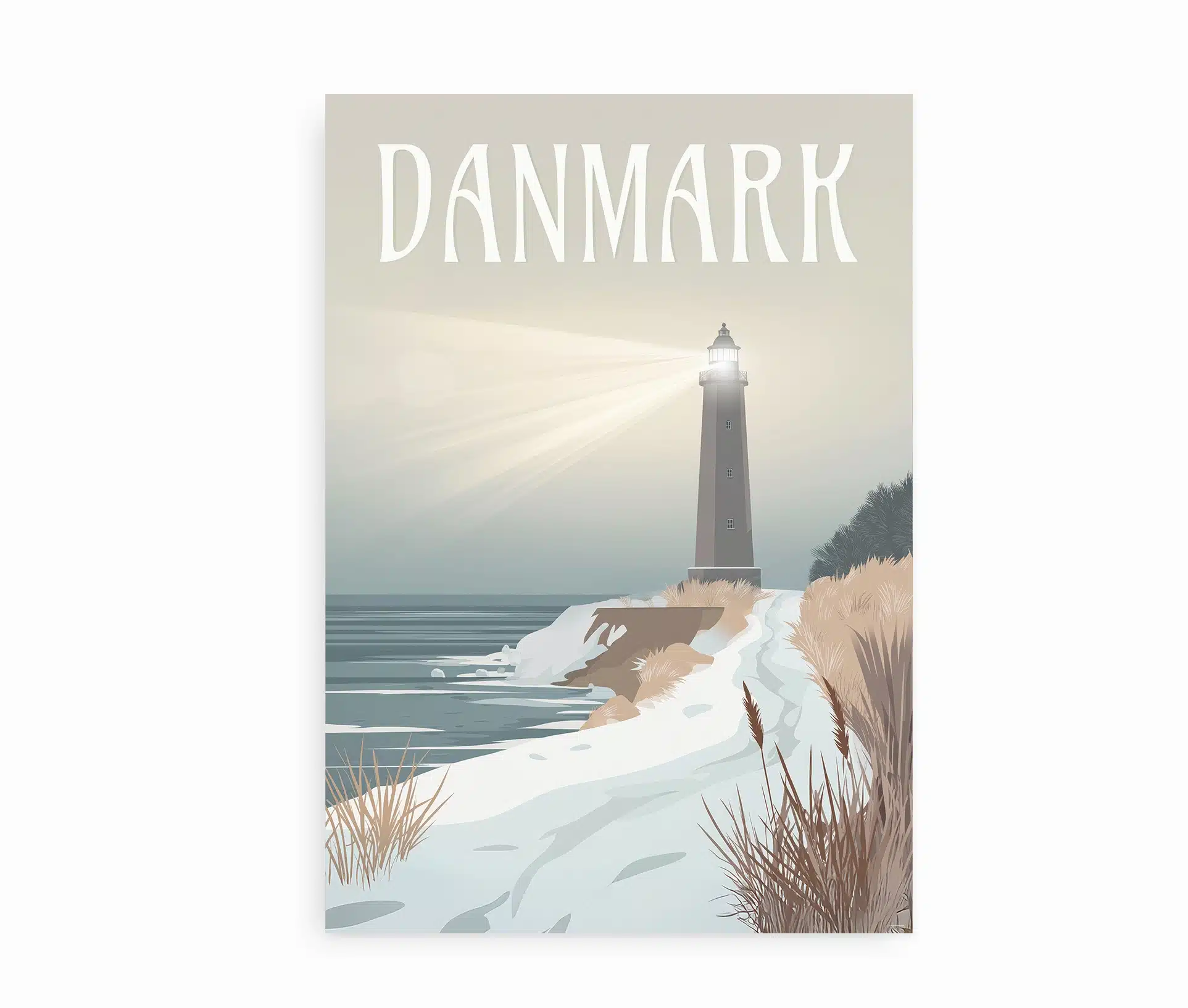 Denne Danmark-plakat indfanger essensen af den danske kyst i vinterdragt. Motivet viser et klassisk fyrtårn, der står solidt i klitlandskabet, mens lyset skærer gennem den dæmpede himmel og leder blikket ud mod havet. Sneen ligger let over sandet, marehalmen bryder de bløde former, og havet fremstår roligt og tidløst. Det er et motiv, der emmer af stilhed, eftertænksomhed og nordisk balance.