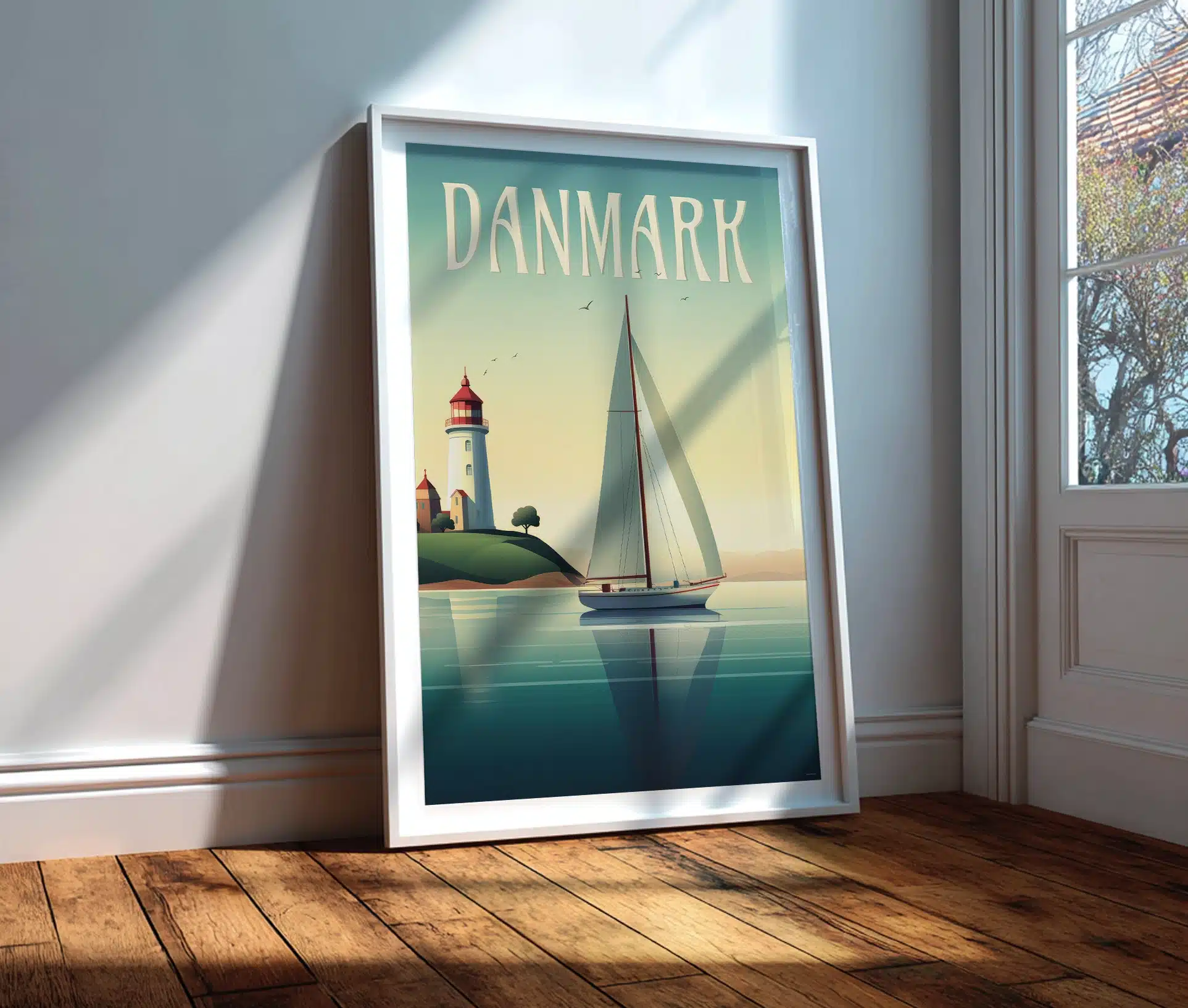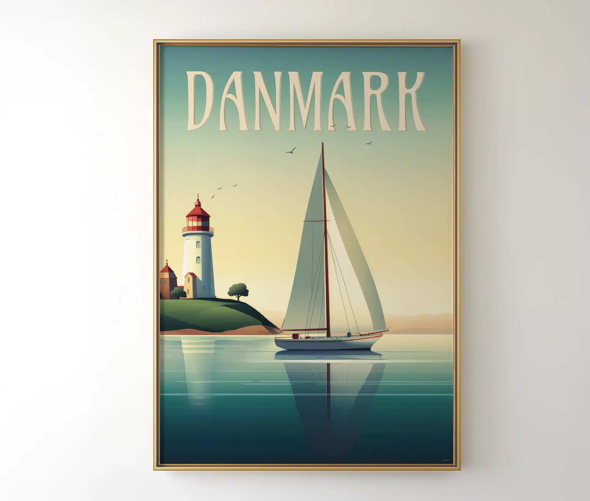 Motivet viser en elegant sejlbåd, der glider stille gennem det rolige vand, mens solen kaster et gyldent skær over himmel og hav. I baggrunden står et klassisk dansk fyrtårn – et symbol på tryghed, retning og eventyr.