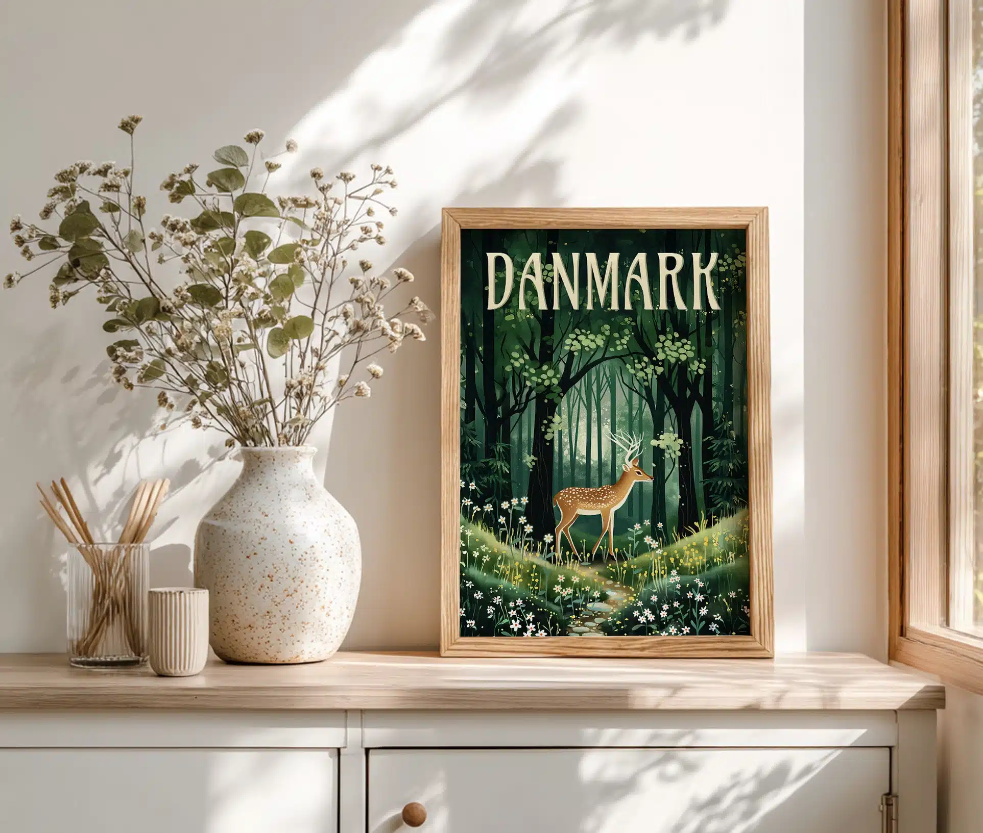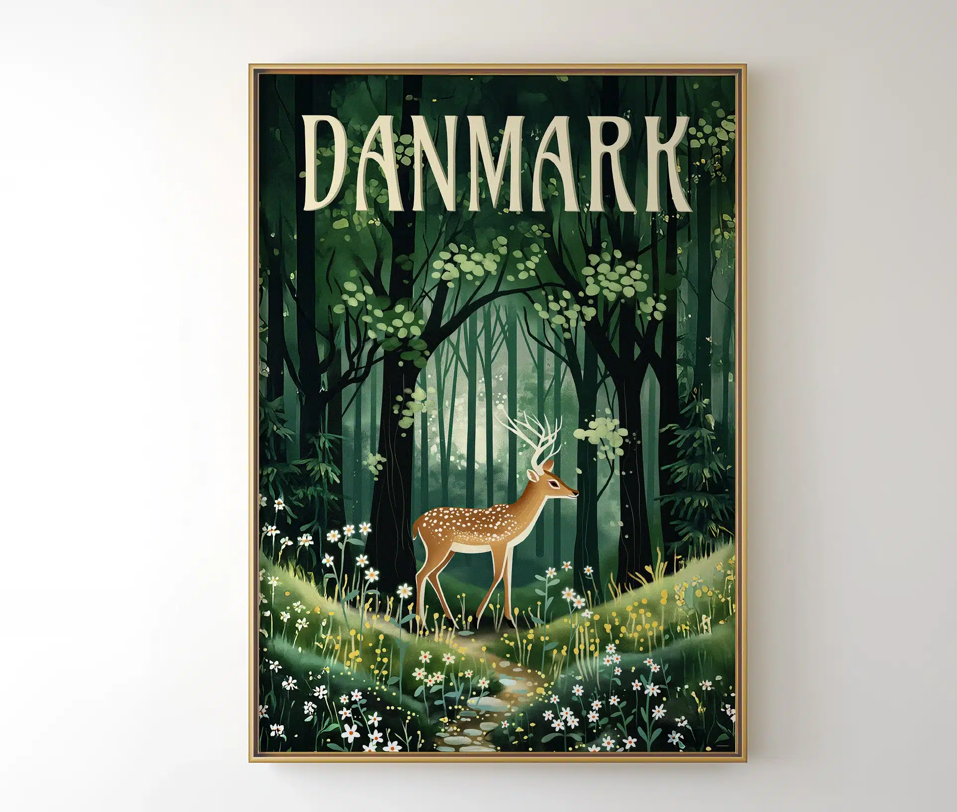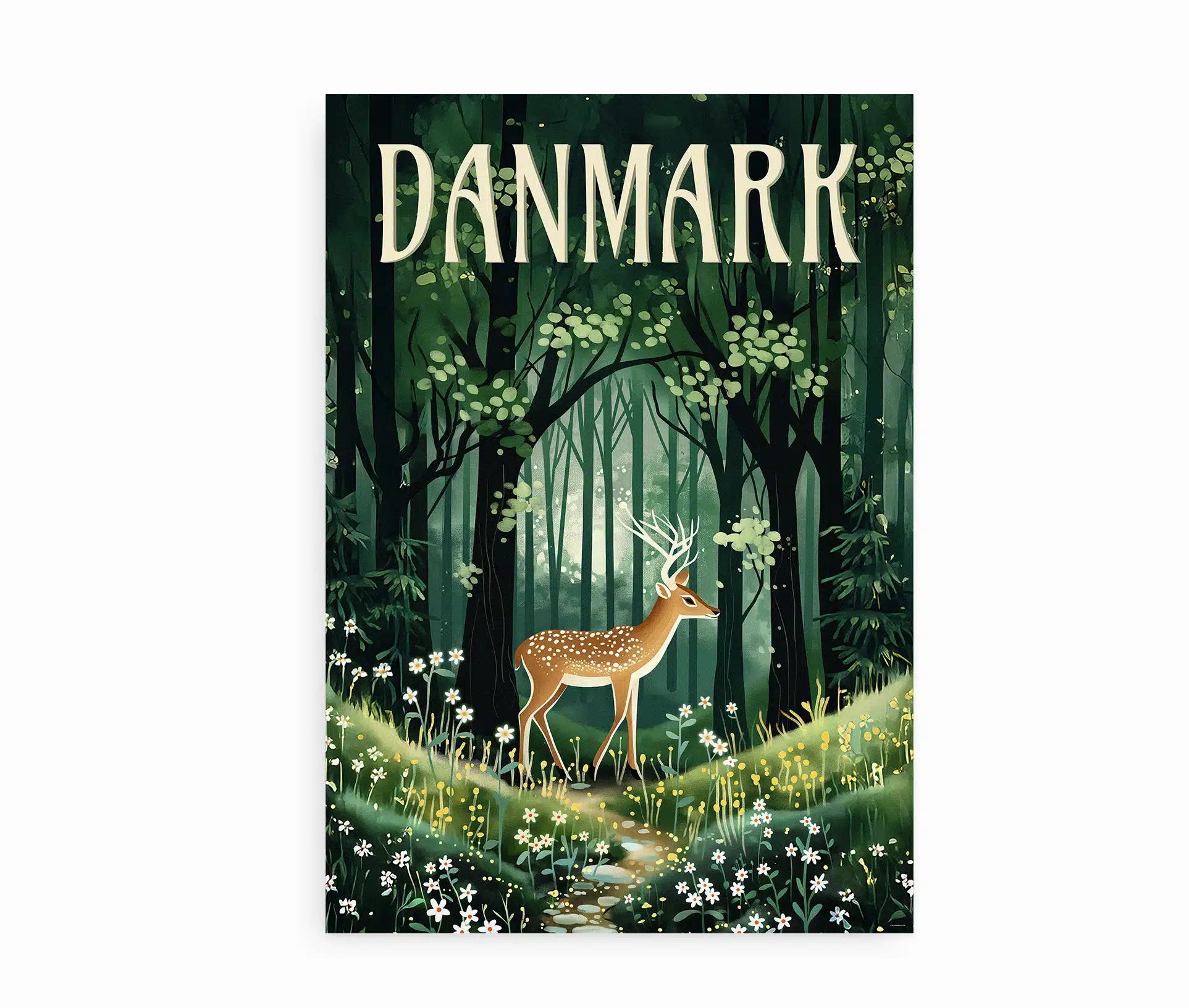 Danmarks forårsskov er en hyldest til den danske natur, når den vågner til live efter vinterens stilhed. Motivet viser et rådyr midt i en frodig, grøn skov, hvor lyset filtreres blødt gennem de unge trækroner. Skovbunden er dækket af forårsblomster i hvide og gule nuancer, og hele scenen emmer af friskhed, ro og ny begyndelse.