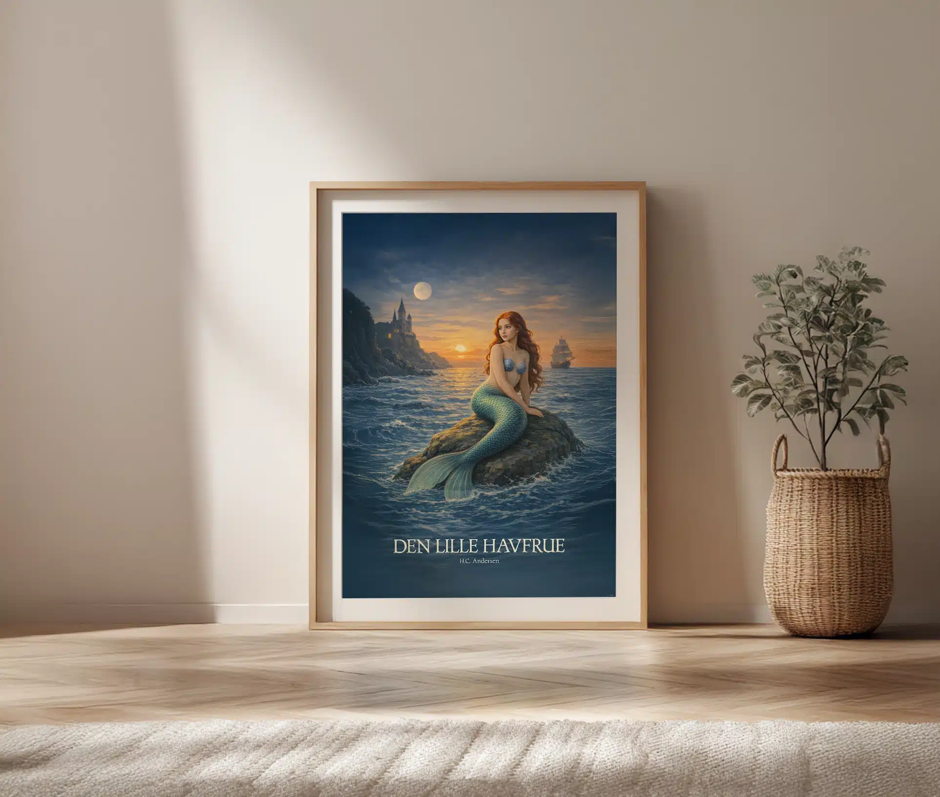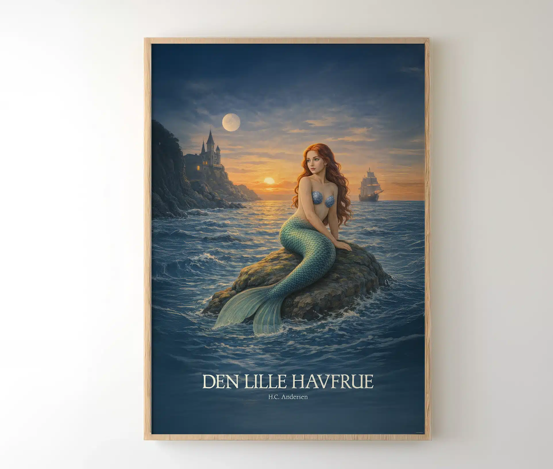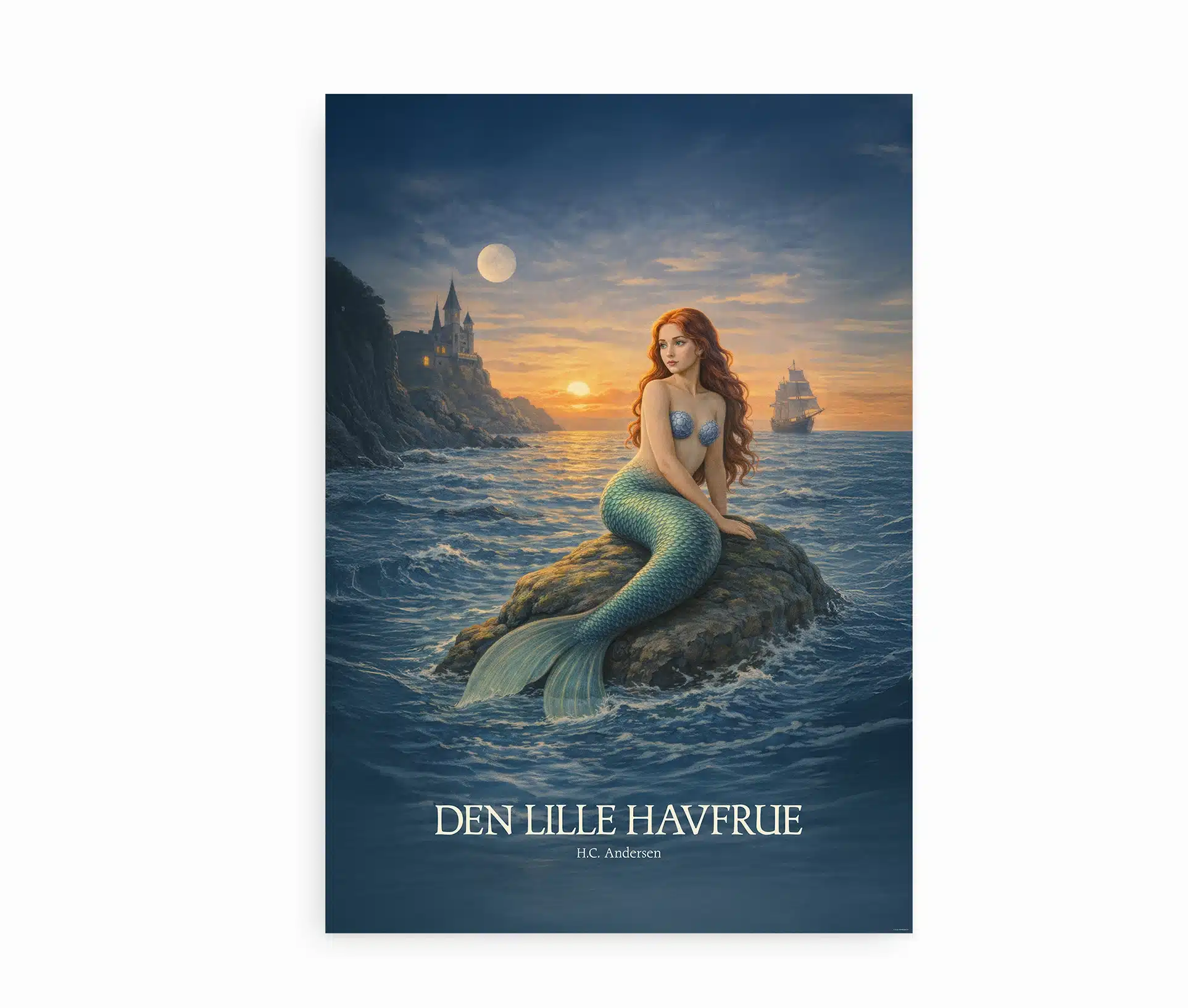 Motivet er stemningsfuldt og dramatisk: havfruen sidder pĂĽ en klippe i det blĂĽ hav, badet i mĂĽnelys og solnedgang, mens et skib sejler i det fjerne. Lyset og farverne fanger bĂĽde havets dybde og hendes stille lĂŚngsel, og plakaten balancerer smukt mellem magi og melankoli.