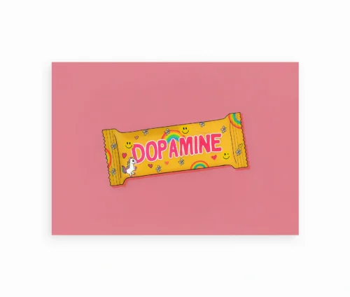 Plakaten Dopamine er et moderne og legende kunstværk, der kombinerer pop art og humor i et farvestrålende design. Motivet viser en slikindpakning i klare gule, pink og regnbuefarvede nuancer, prydet med smilies, hjerter og små illustrationer, alt sammen på en varm rosa baggrund. Midt på indpakningen står ordet Dopamine, som refererer til hjernens lykkehormon – en genial visuel metafor for glæde og energi.