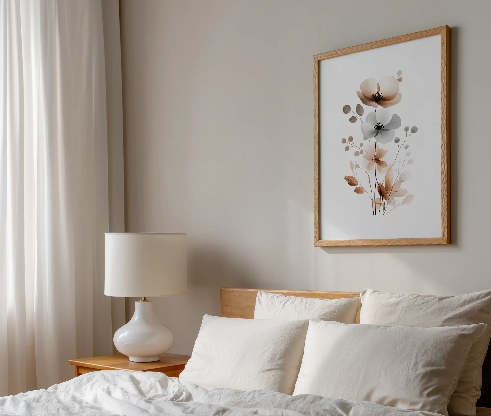 Denne plakat med efterårsblomster forener naturens skønhed med et moderne og minimalistisk udtryk. Motivet er udført i akvarelstil med bløde penselstrøg, der skaber en let og elegant atmosfære. De støvede nuancer i beige, brun og grå giver et varmt, men samtidig roligt udtryk, som passer smukt ind i enhver nordisk inspireret indretning.