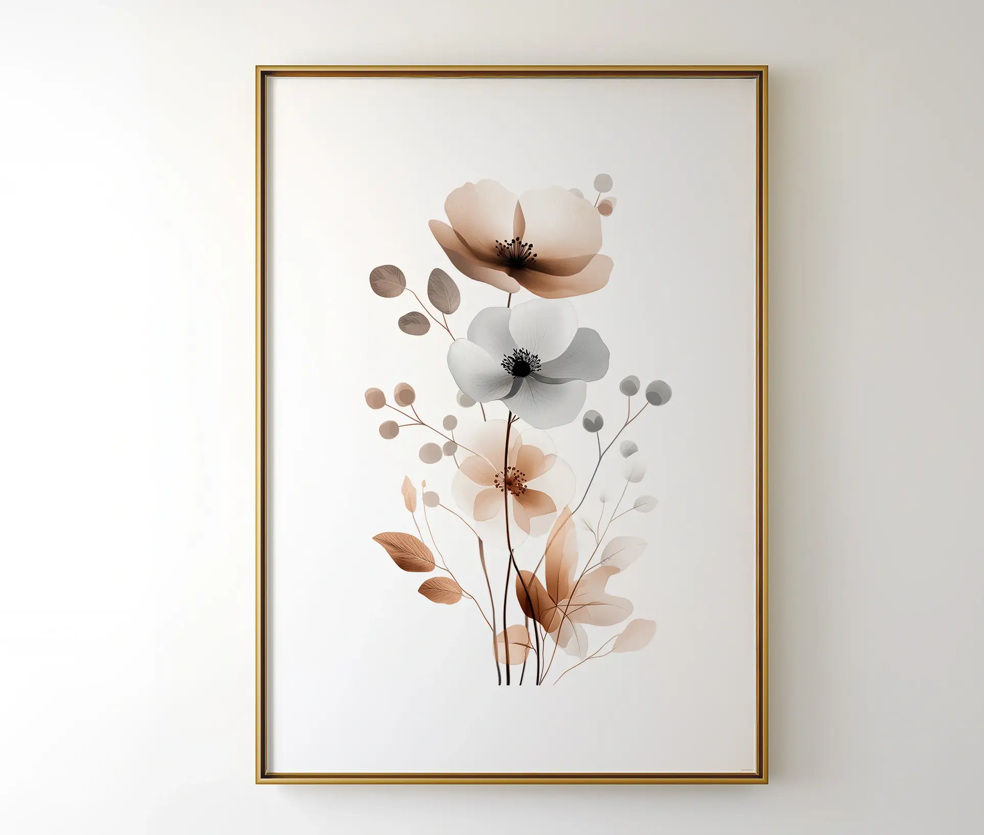 Blomsterne fremstår detaljerede, men med en let gennemsigtighed i farvelagene, der giver plakaten et luftigt og harmonisk udtryk. Det enkle design gør den særligt velegnet til at skabe en følelse af ro og balance i hjemmet – uanset om den hænger alene eller kombineres med andre kunstplakater.
