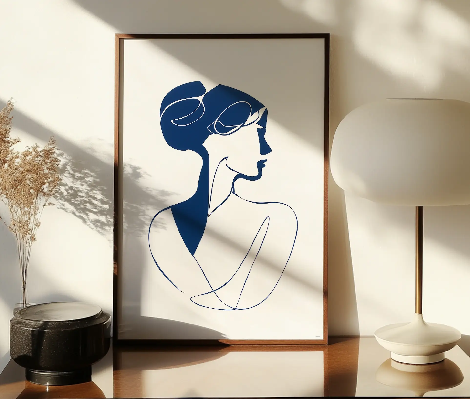 Denne kunstplakat er et raffineret udtryk for skønhed og enkelhed, hvor en kvindes profil er gengivet i en elegant, mørkeblå stregtegning. Med få, flydende linjer og grafisk præcision portrætteres en kvinde i profil med opsat hår og et roligt udtryk, der udstråler både styrke og ynde. Enkelheden i motivet lader fantasien få frit spil, mens den mørkeblå farve giver kontrast og karakter til det hvide baggrund.