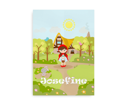Plakaten med den lille Rødhætte findes i 5 forskellige størrelser og skal tilpasses med barnets navn. Du indtaster blot navnet i feltet herover, inden du føjer den ønskede størrelse til kurven.