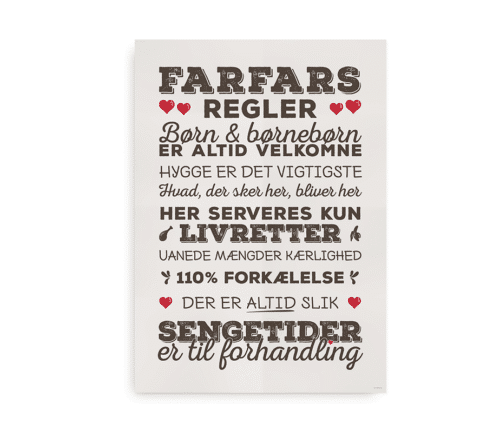 “Farfars Regler” er en meget fin plakat med farfars husregler, som ikke minder om de mange strenge regler hjemme. Her sidder historierne lige så løst som kærligheden, som der gives mere end rigeligt af.