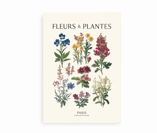 Plakaten Fleurs & Plantes er en hyldest til naturens skønhed og klassisk botanisk kunst. Med detaljerede illustrationer af forskellige blomster og urter, gengivet i smukke farver, kombinerer plakaten videnskabelig præcision med kunstnerisk elegance. De latinske og franske referencer giver plakaten et vintageudtryk, som leder tankerne hen på gamle botaniske bøger og herbariumsamlinger.