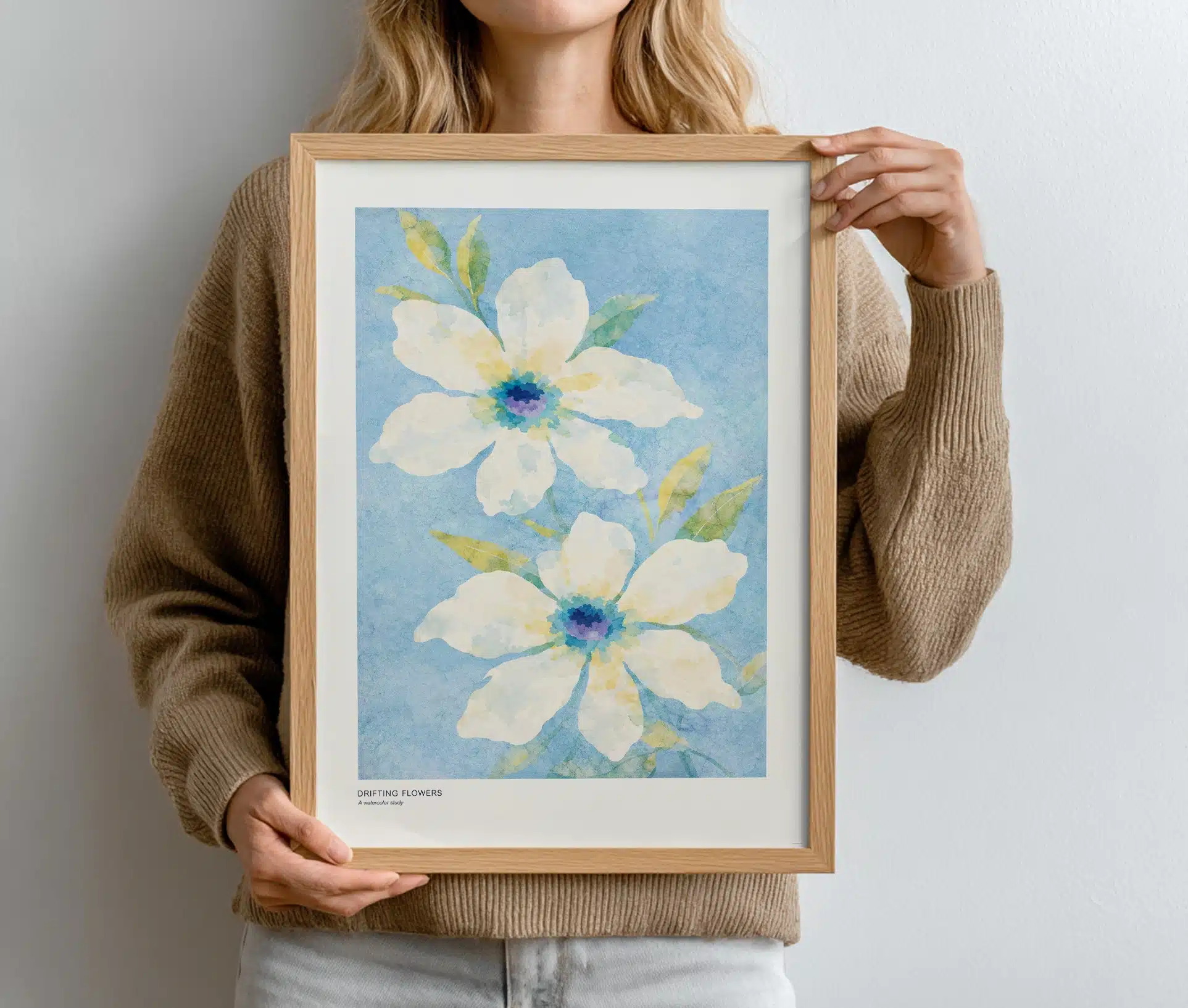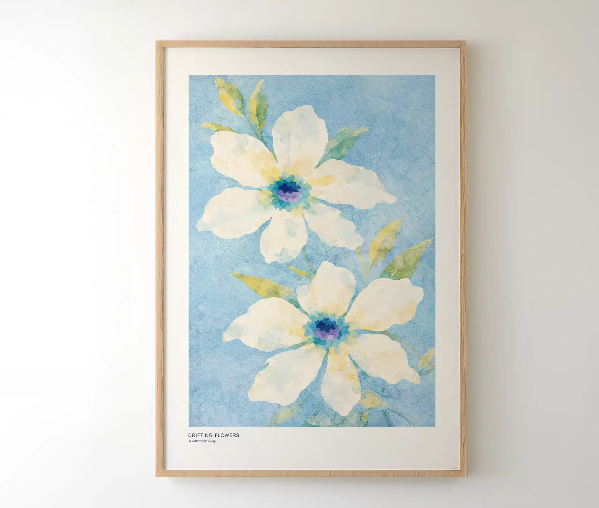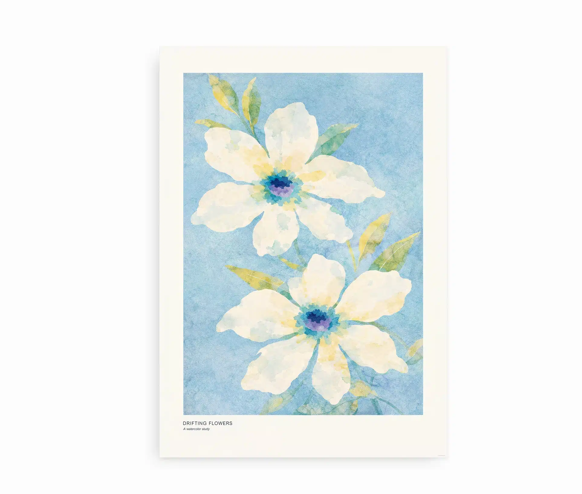 Oplev den beroligende skønhed i denne smukke akvarelplakat med titlen Drifting Flowers. Plakaten fremviser to elegante hvide blomster, der svæver let på en blød lyseblå baggrund. De delikate blomsterblade er malet i varme cremefarver med subtile gule nuancer, mens blomsternes midte skaber et fascinerende fokuspunkt med deres dybe blå og lilla toner. De grønne blade, der omgiver blomsterne, tilføjer en naturlig friskhed og balance til kompositionen.