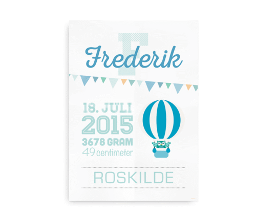 Fødselstavle med luftballon og en lille festlig ugle. Fødselsplakaten kan du tilpasse med navn, fødselsdato, -længde, -sted og -tidspunkt, så det bliver en helt unik plakat til fødselsdagen, barnedåben eller barselsgaven.