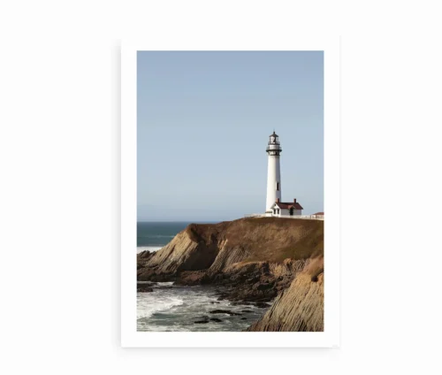 Denne smukke fyrtårnsplakat indfanger det majestætiske syn af et klassisk fyrtårn placeret dramatisk på klipperne med havet brusende nedenfor. Motivet er enkelt og stilrent, men samtidig kraftfuldt, da det formår at forene ro og styrke i ét udtryk. Med den klare blå himmel, det skarpe lys og de markante klippeformationer bliver plakaten et tidløst fotografisk kunstværk, der leder tankerne hen på maritime traditioner, frihed og naturens uendelighed.