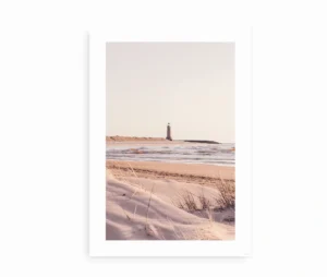 Denne smukke plakat indfanger essensen af nordisk natur med sit rolige motiv af et fyrtårn ved en kyststrækning. De bløde farvetoner i beige, gråblå og pastel lyser op med en let og luftig stemning, der giver et nærmest meditativt udtryk. Sanddynerne glider blidt ned mod det stille hav, mens det majestætiske fyrtårn rejser sig i horisonten og symboliserer tryghed, retning og balance.