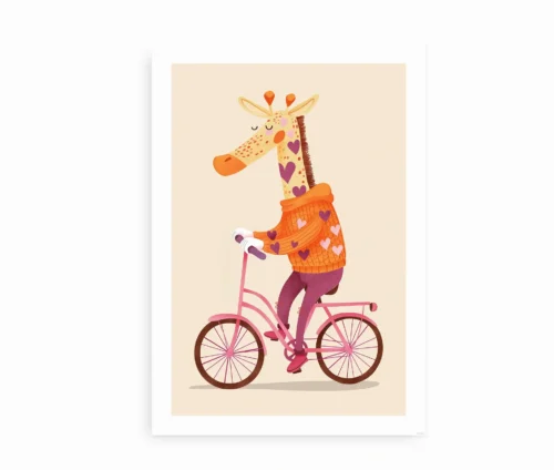 Lad fantasien få frit løb med denne charmerende plakat med en cyklende giraf – perfekt til at sætte et smil på læben og tilføre varme til ethvert børneværelse. Motivet viser en høj og stolt giraf iført en orange sweater dekoreret med farverige hjerter, mens den roligt kører afsted på en pink cykel. Farvepaletten består af varme nuancer i orange, lilla og rosa, som skaber en blød og hyggelig stemning.