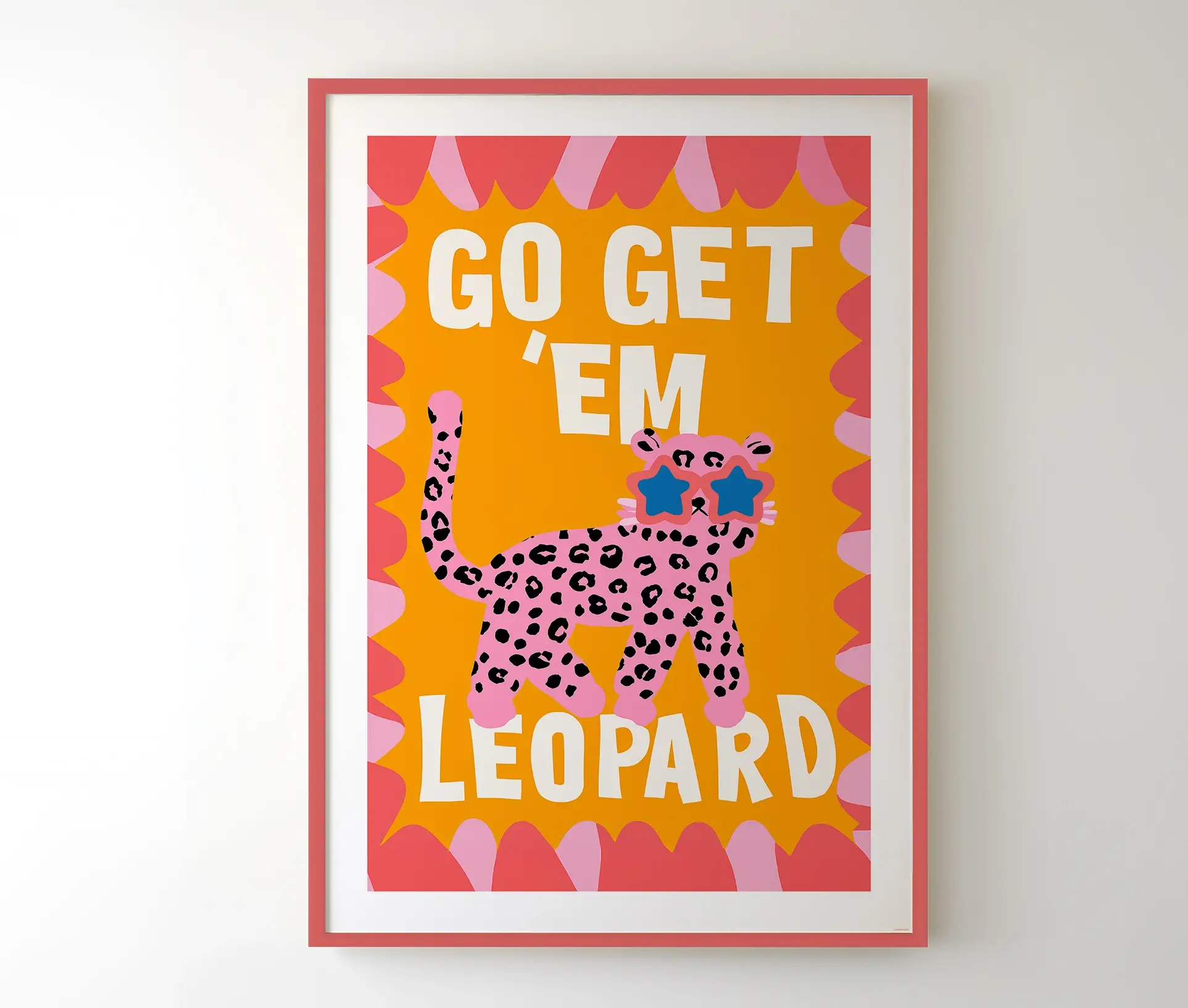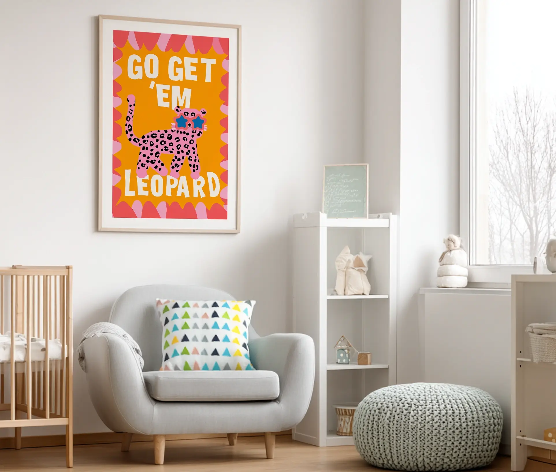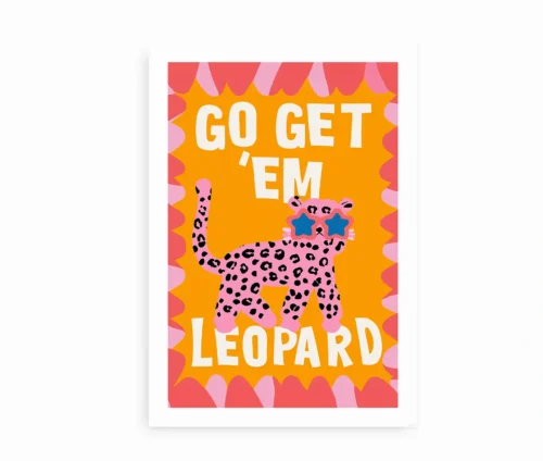 Denne plakat er et farverigt spark bagi fyldt med selvtillid, attitude og charme. Med teksten “Go Get ’Em Leopard” og en lyserød leopard iført blå stjerneformede solbriller er budskabet klart: Tro på dig selv og gå efter det! Designet kombinerer energiske farver og legende illustration i en plakat, der spreder god energi og smil, uanset hvor den hænger.