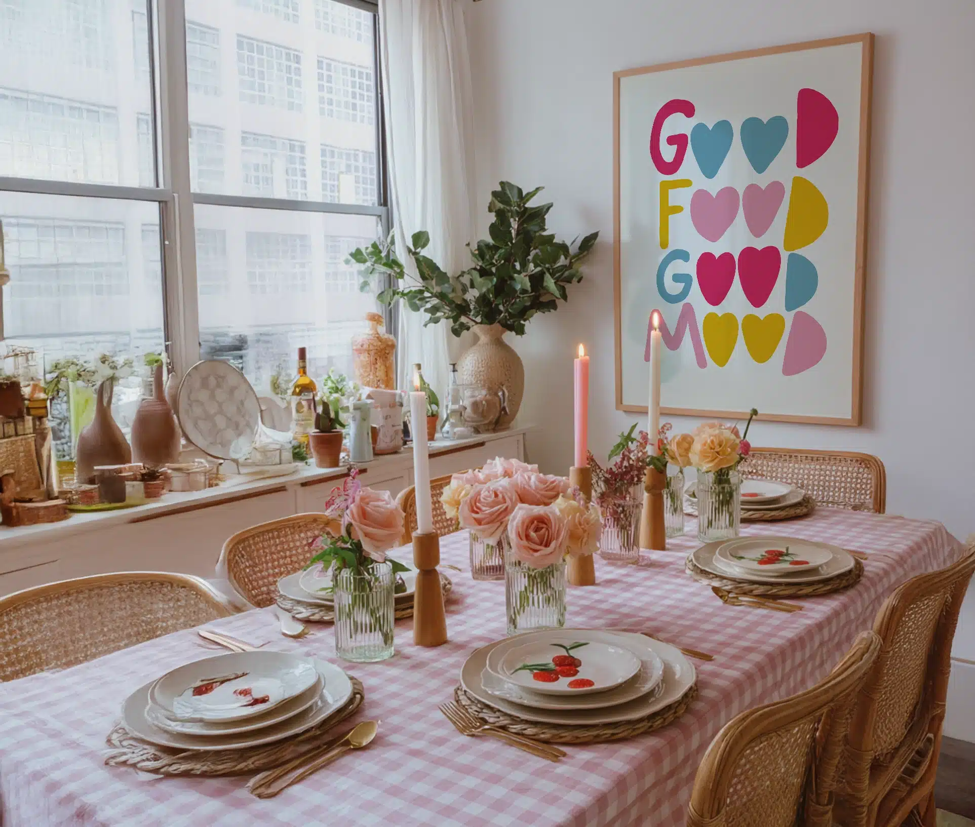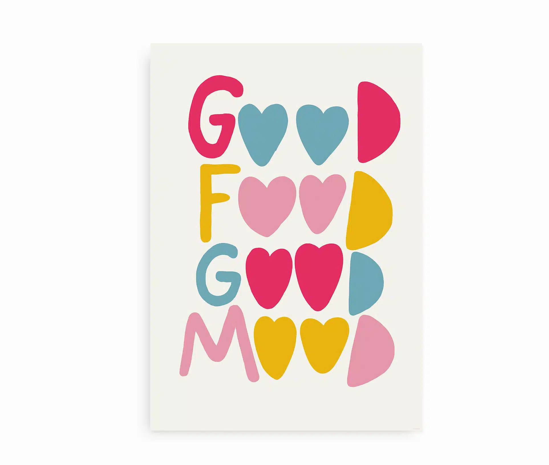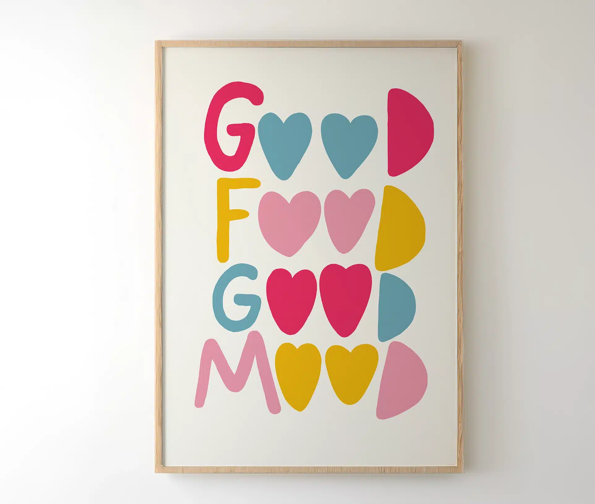 Good Food Good Mood er en farverig og moderne plakat, der bringer glæde og energi ind i køkkenet eller spisestuen. De håndtegnede bogstaver og hjerteformer i pink, gul, blå og lyserød skaber et legende og kærligt udtryk, der minder dig om alt det gode i hverdagen.
