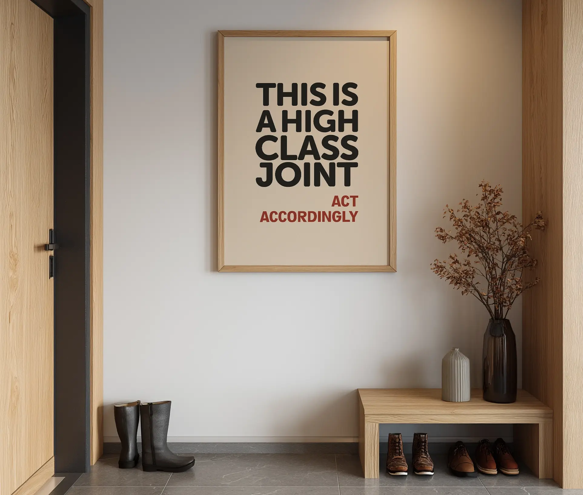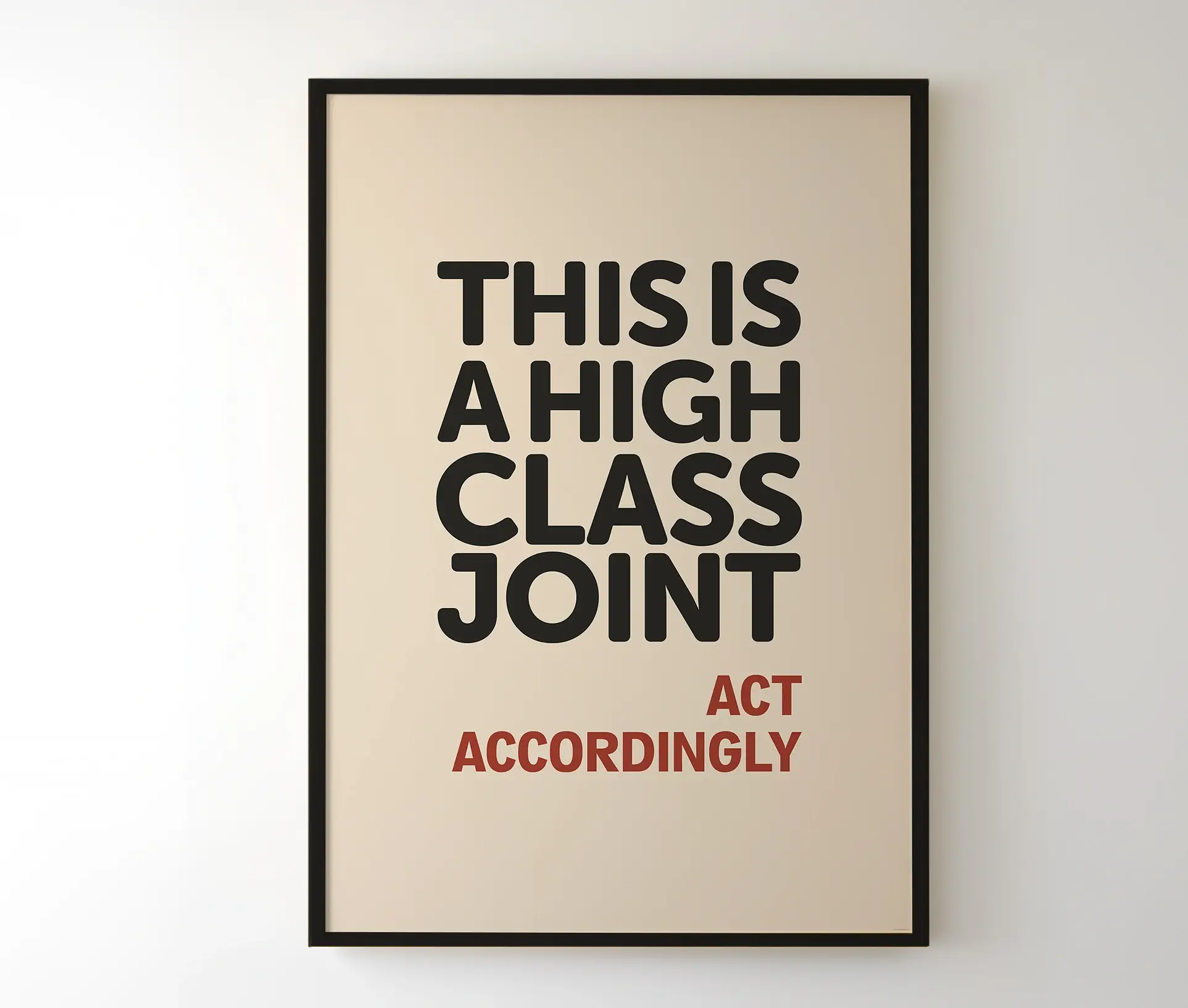 High Class Joint plakaten er en humoristisk og stilren tekstplakat, der kombinerer enkel typografi med et skarpt budskab. Med teksten “This is a High Class Joint – Act Accordingly” fungerer den som et legende. Men alligevel elegant statement piece i din indretning. Plakaten er trykt på neutral baggrund med tydelig sort og rød tekst. Hvilket giver den et grafisk udtryk, der passer ind i både moderne og klassiske hjem.
