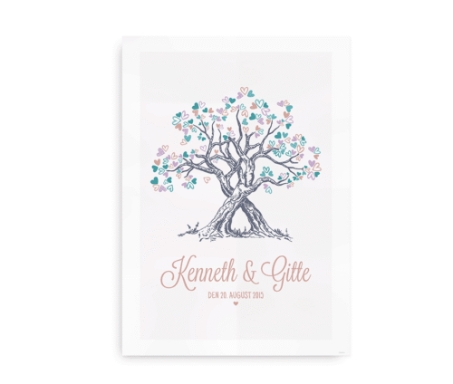 Bryllupsplakat med flot illustration af to træer, som krydser hinanden og danner en fælles krone af hjerter. En flot gave til bryllup, som på perfekt vis fremviser navnene på det lykkelige par, dato for den store dag og udstråler masser af kærlighed.