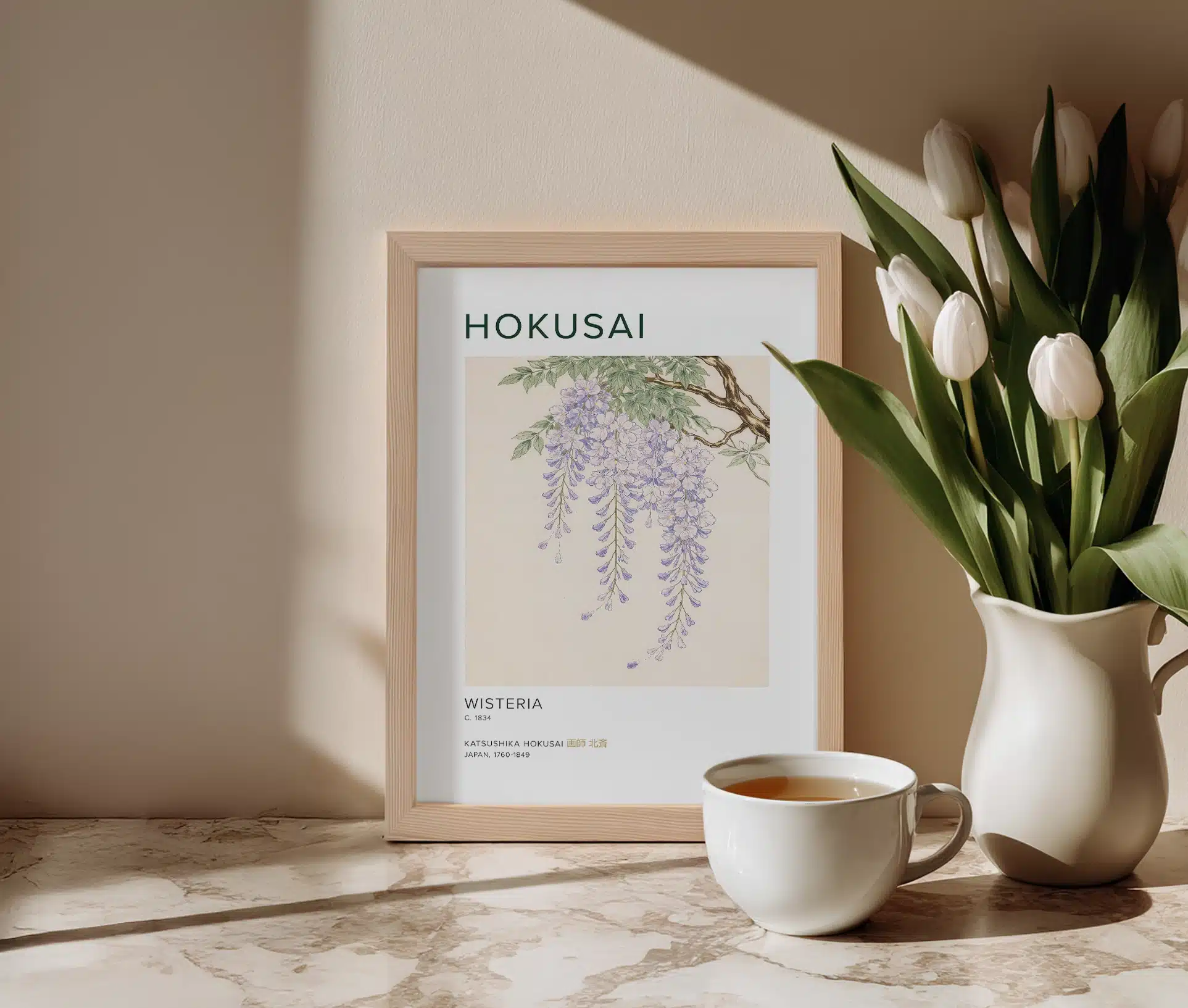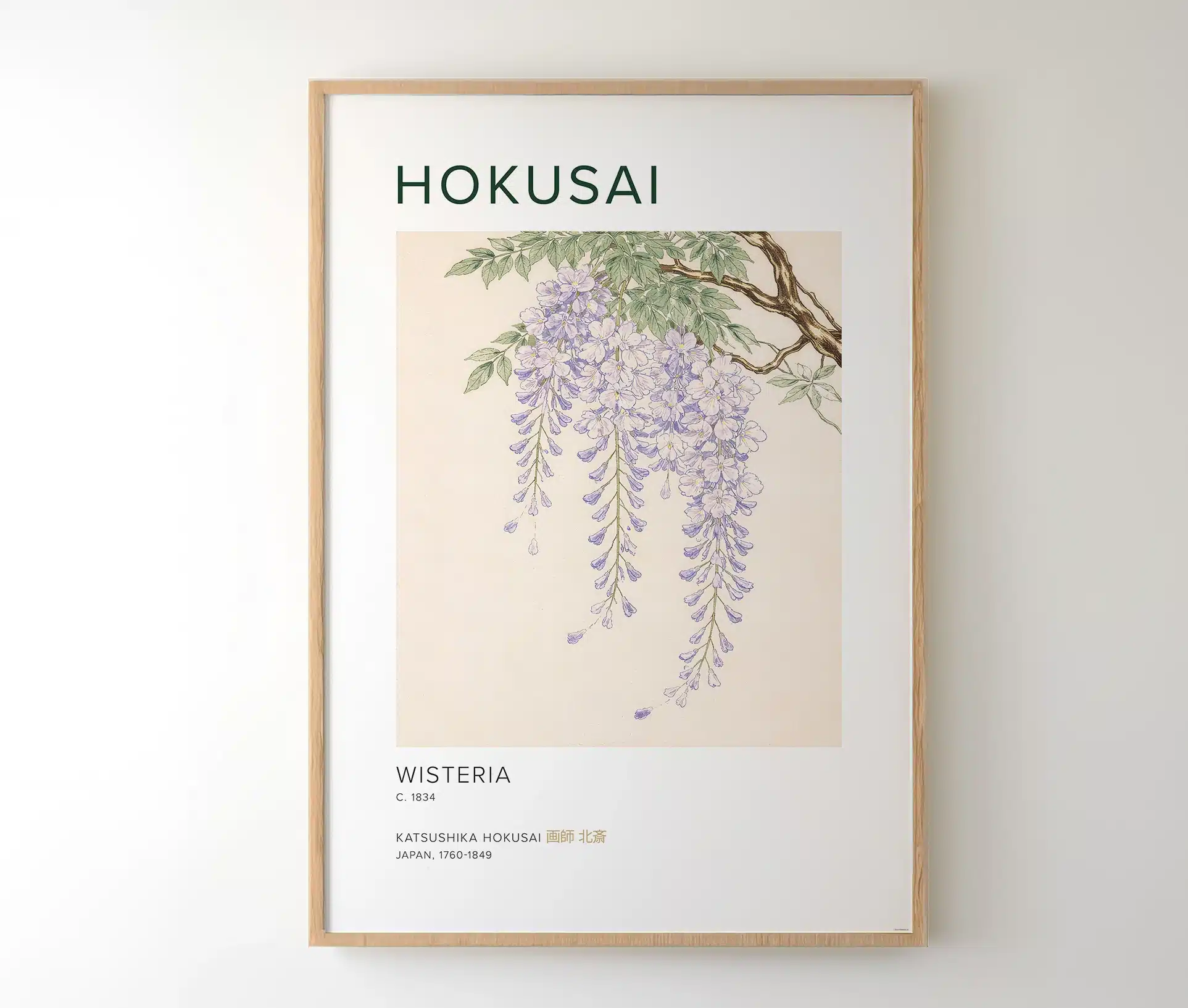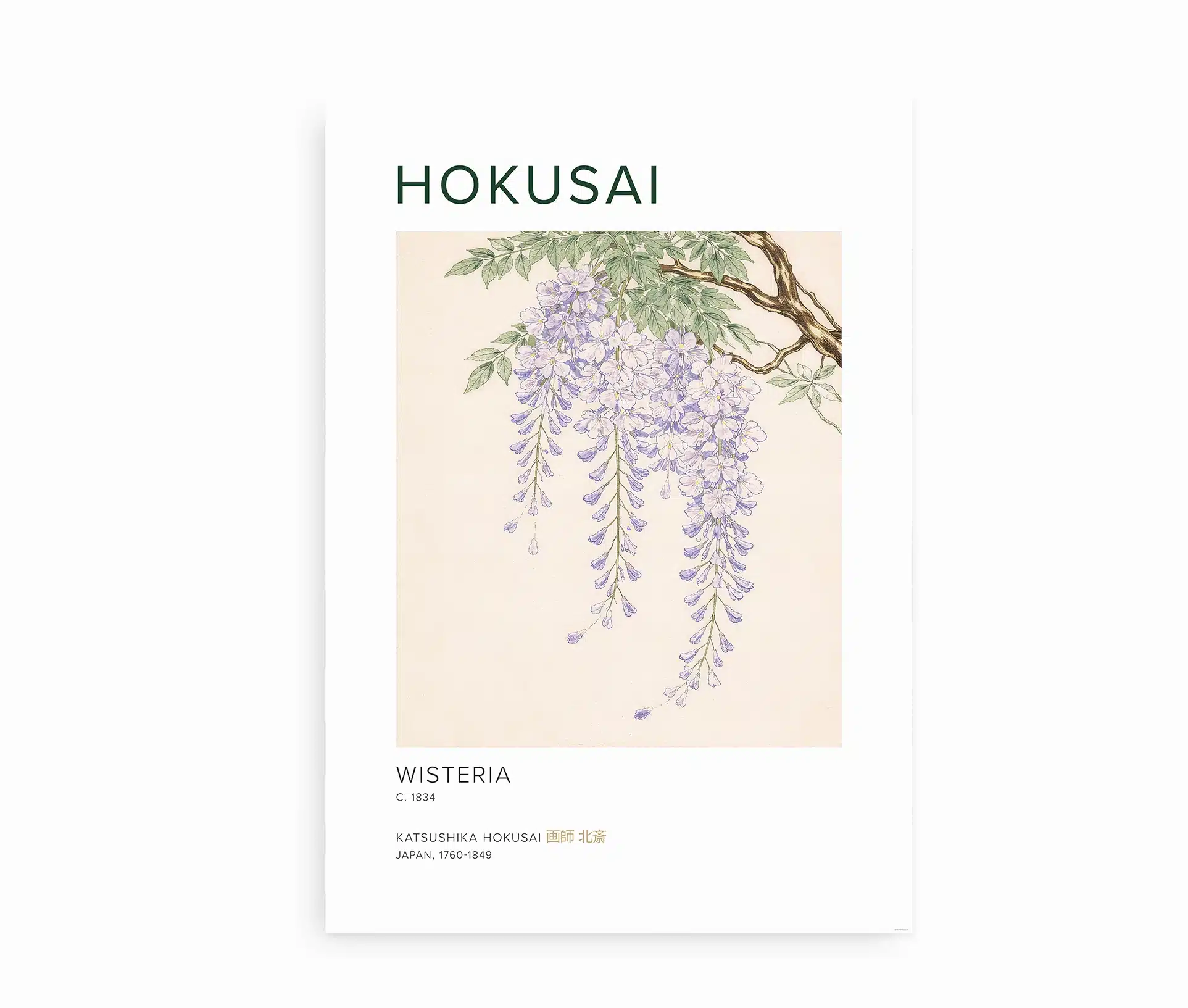 På plakaten står teksten “Hokusai” øverst, som refererer til kunstneren Katsushika Hokusai (1760–1849) – en af Japans mest berømte kunstnere. Under motivet står “Wisteria, c. 1834”, som henviser til værket og perioden, hvor motivet blev skabt. Teksten giver plakaten et klassisk og kunsthistorisk udtryk, som gør den perfekt til både kunstelskere og dem, der ønsker et stilfuldt naturmotiv i hjemmet.