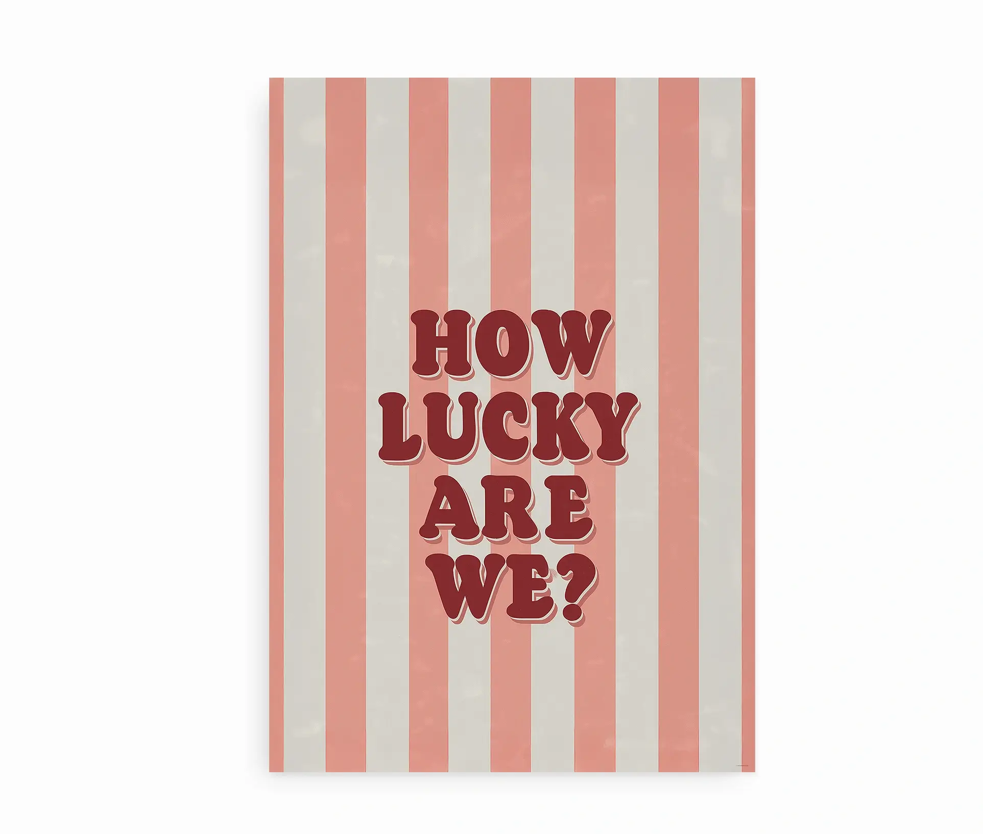 Bring et smil og lidt eftertænksomhed ind i dit hjem med denne charmerende plakat med teksten “How Lucky Are We?”. Designet kombinerer en enkel, men effektfuld typografi med en stribet baggrund i bløde nuancer, der skaber et tydeligt retroinspireret udtryk. Den varme farvepalet med rødbrune bogstaver på lyserøde og beige striber giver plakaten et legende, men samtidig stilrent look.