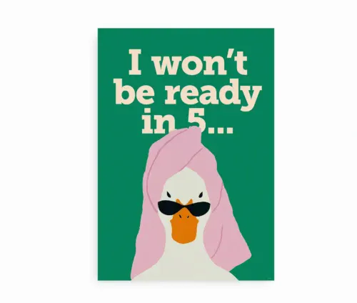 Denne plakat med teksten “I won’t be ready in 5…” og en attitude-fyldt and i håndklæde og solbriller er det perfekte humoristiske indslag til hjemmet. Med sin markante grønne baggrund og stilrene, grafiske design. Kombinerer plakaten et stærkt farveudtryk med en sjov kommentar, som de fleste kan relatere til. Uanset om den hænger ved badeværelsesspejlet, over makeupbordet eller i entréen, giver den smil på læben og personlighed til din indretning.
