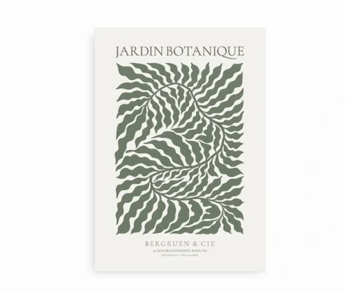 Farvepaletten er afdæmpet og naturlig med dybgrønne toner mod en lys baggrund, hvilket gør plakaten særligt velegnet til indretninger, hvor man ønsker ro og æstetisk balance. Uanset om den hænger alene eller i selskab med andre plakater fra Jardin Botanique-serien, tilføjer den et sofistikeret kunstnerisk udtryk.