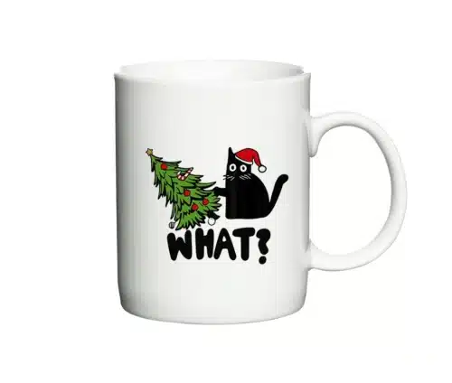 Dette sjove og charmerende julekrus har et motiv, der rammer plet for enhver katteejer: En sort kat iført nissehue sidder uskyldigt ved siden af et væltet juletræ – som om den ikke aner, hvordan det kunne ske. Under motivet står teksten “WHAT?”, og det er præcis den stemning, du kender fra december, når julefreden bliver udfordret af nysgerrige poter og blinkende julepynt.
