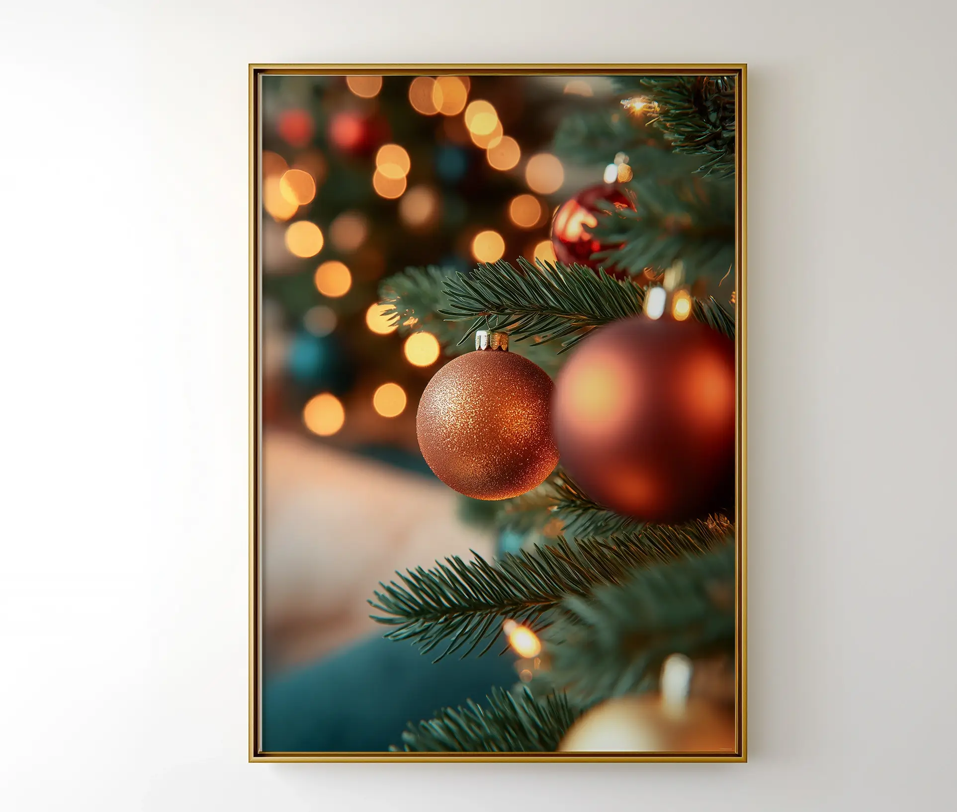 Motivet viser glitrende julekugler på en grøn grangren, badet i varmt julelys og omgivet af bløde, gyldne bokeh-lys i baggrunden.