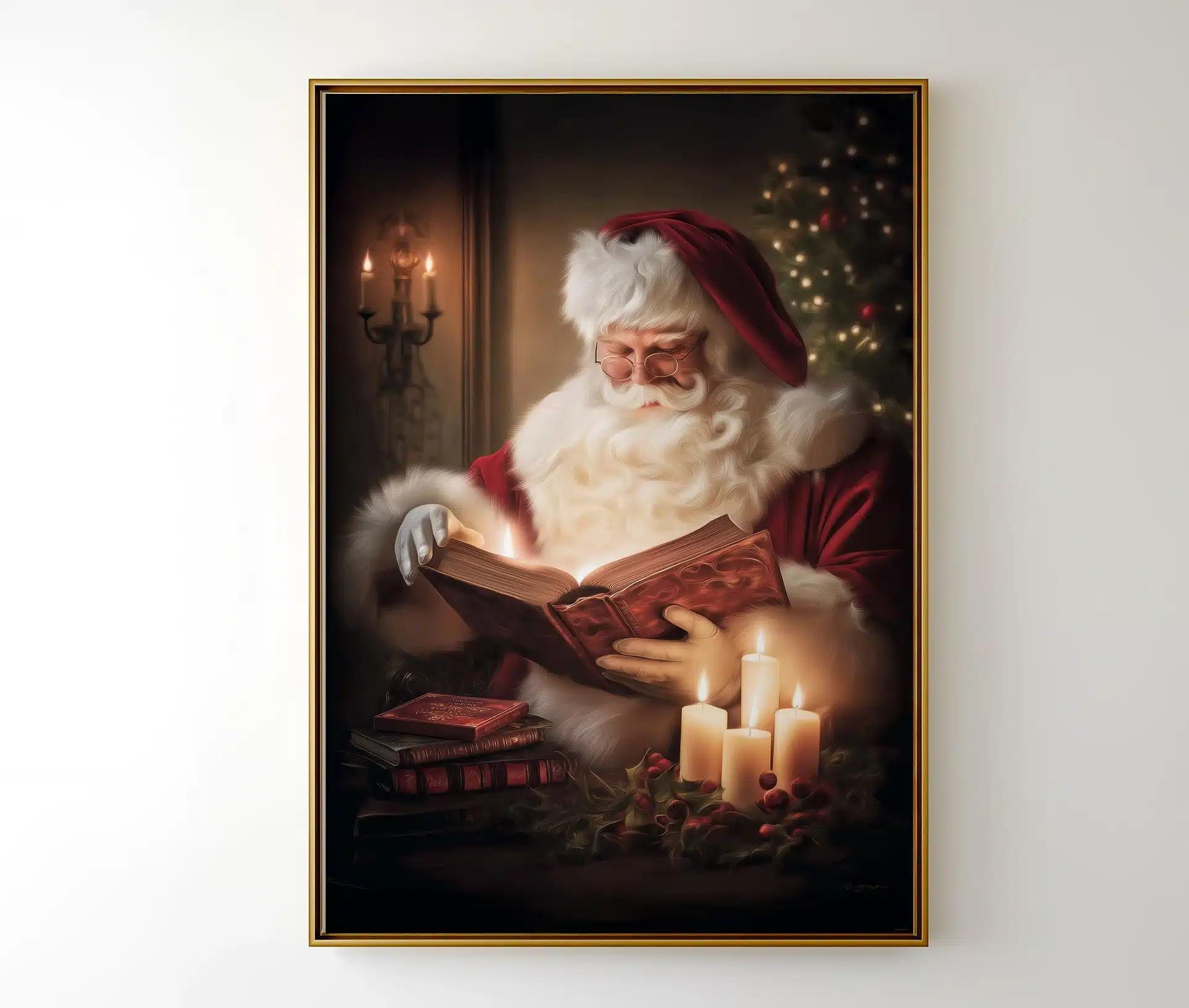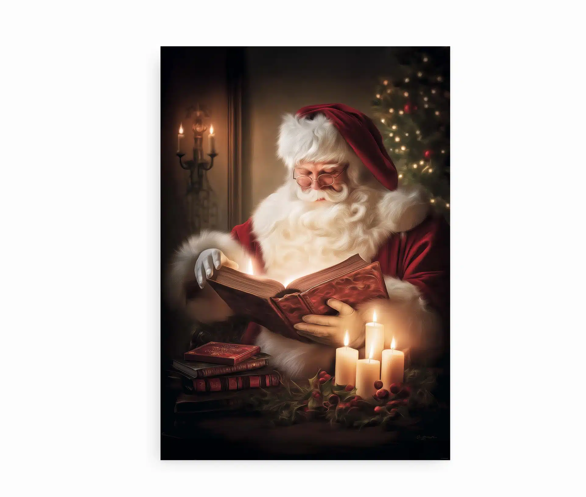Denne stemningsfulde plakat bringer julens magi til live. Julemanden læser juleeventyr viser en klassisk julemand omgivet af levende lys og gamle bøger, mens han fordyber sig i julefortællingerne. Lyset fra stearinlysene og det varme skær fra juletræet i baggrunden skaber en helt særlig ro – en påmindelse om julens fredfyldte øjeblikke.