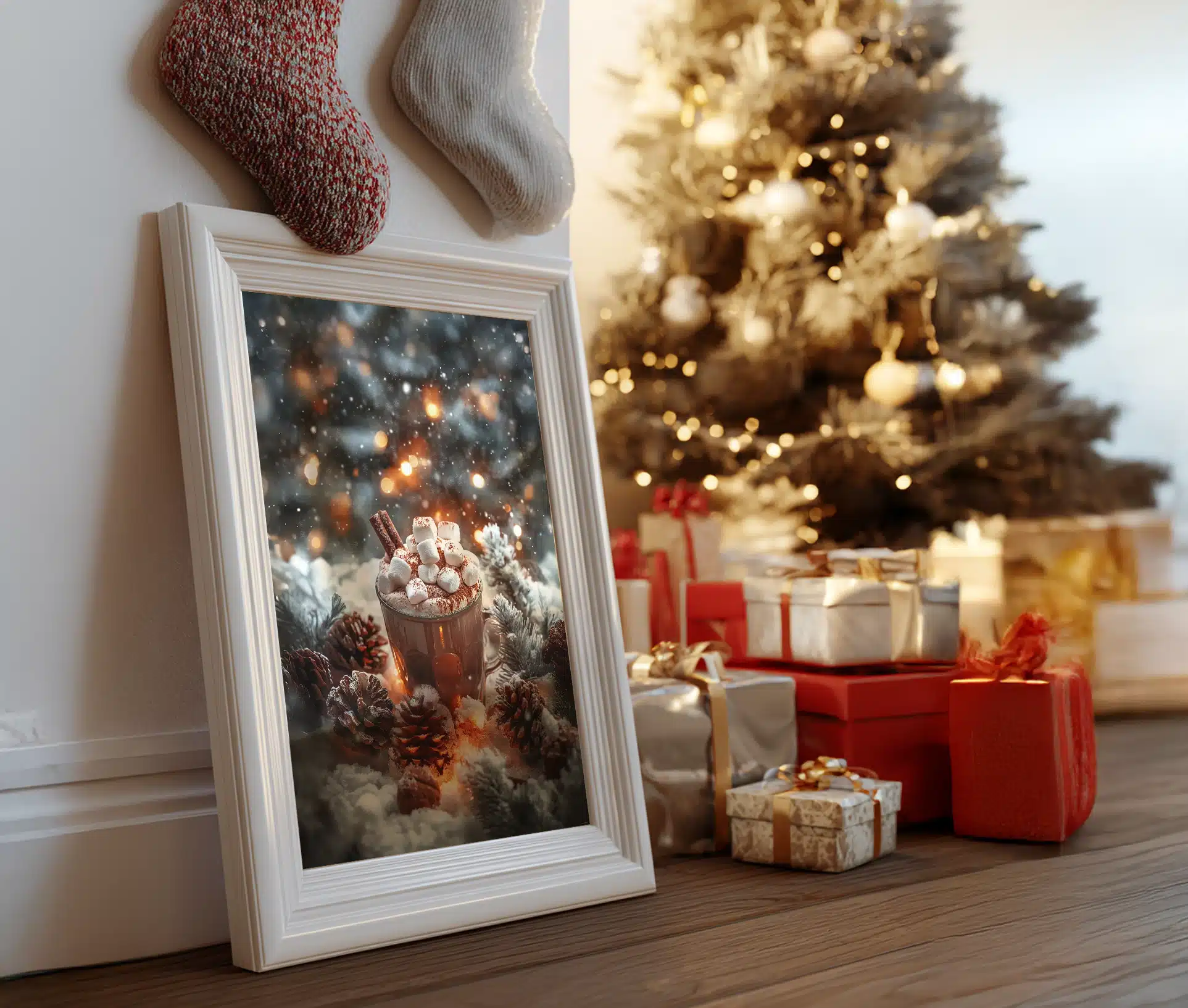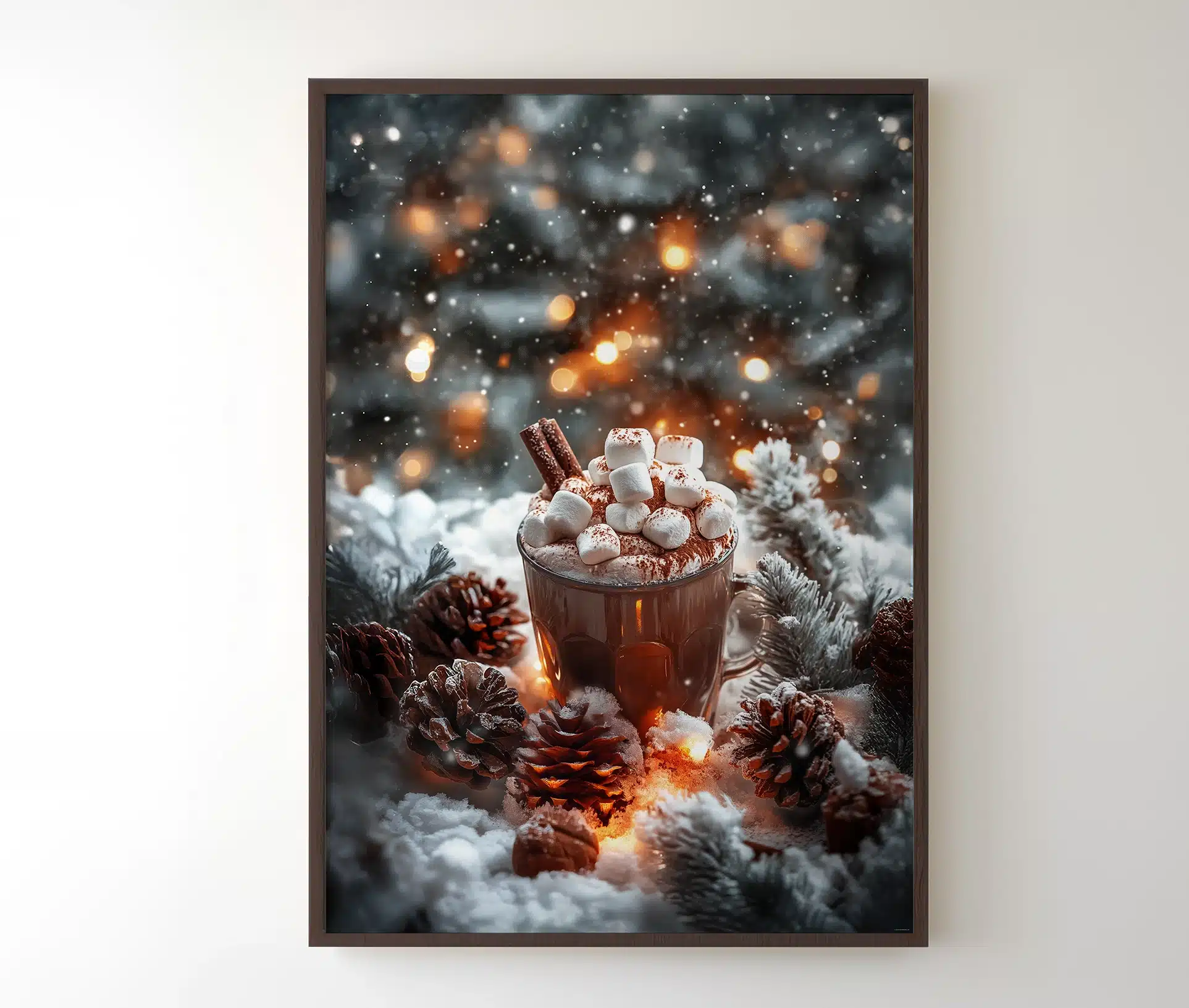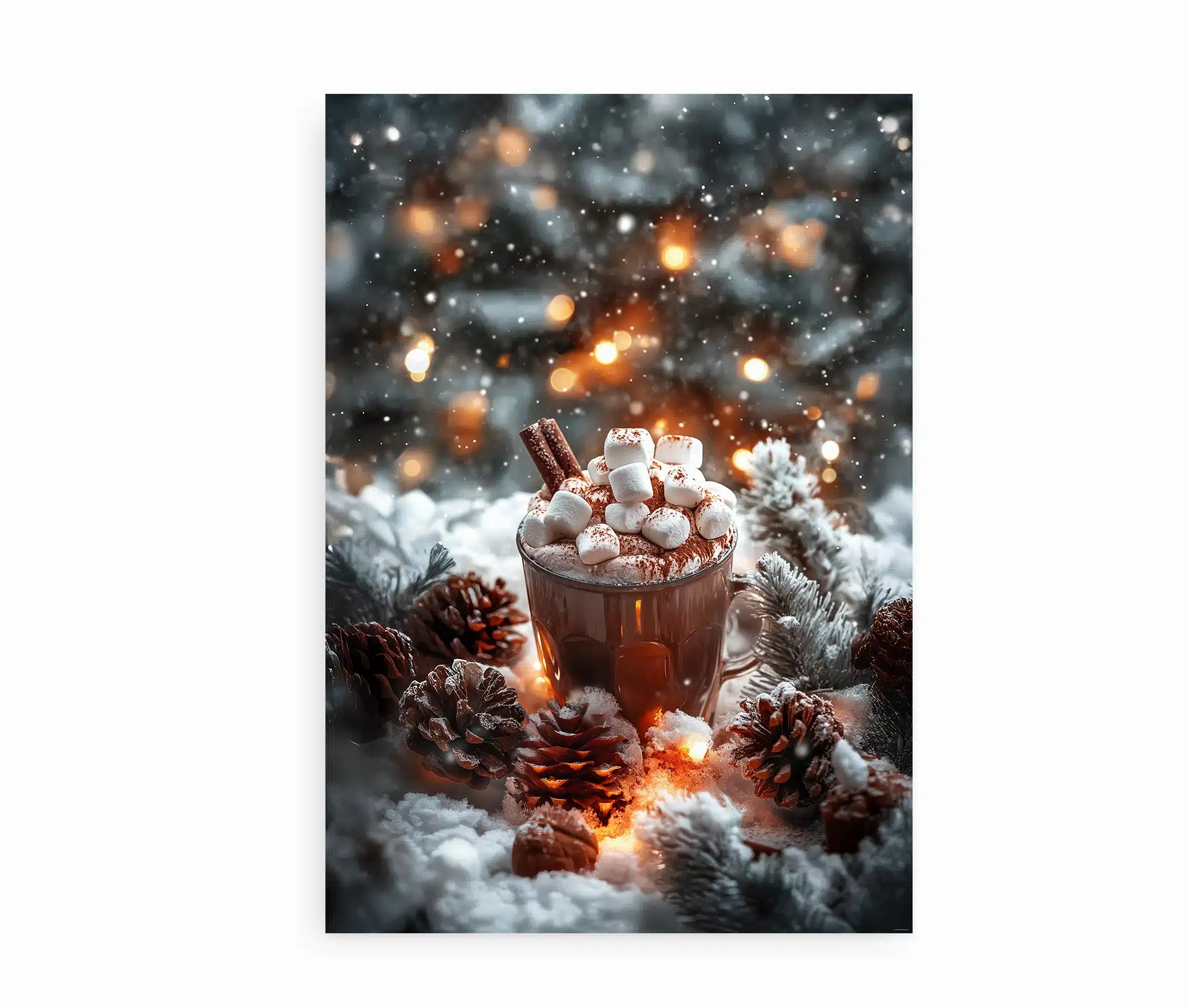 Denne smukke Juleplakat med varm kakao indfanger essensen af vinterhygge – et varmt øjeblik midt i kulden, omgivet af gran, kogler og bløde lysglimt.