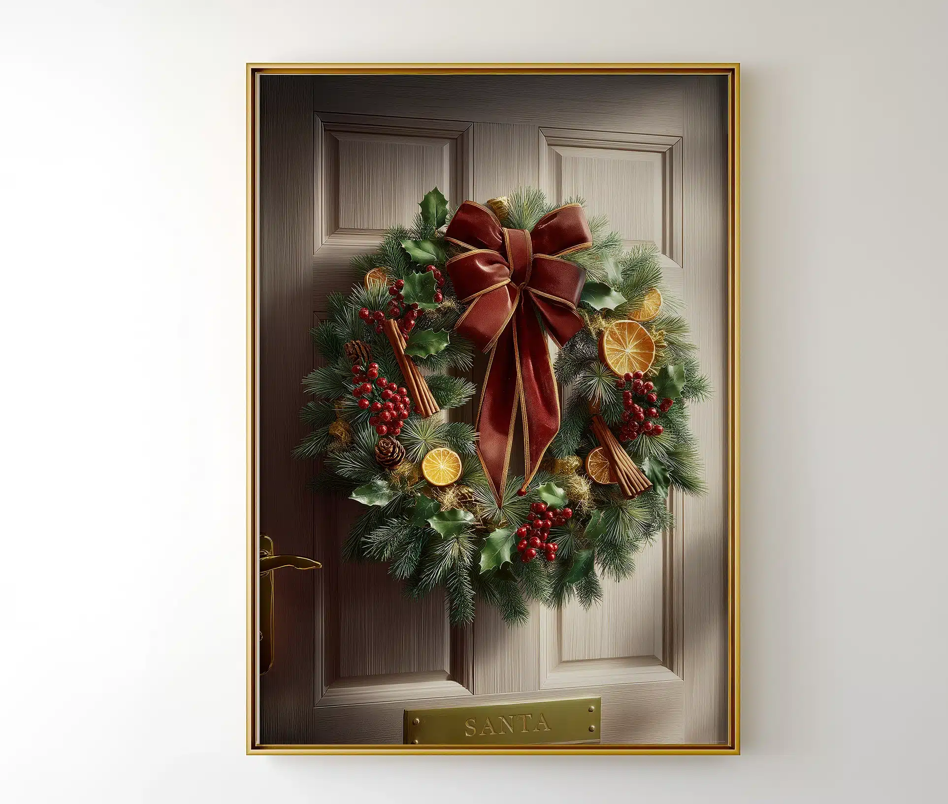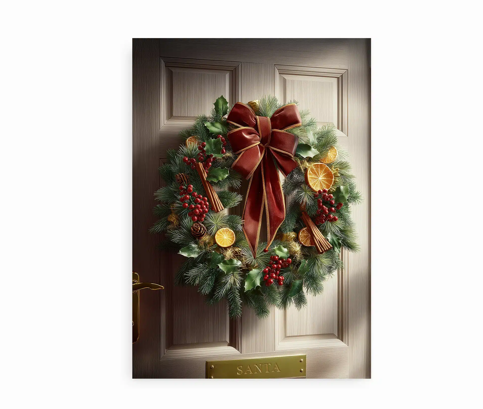 Denne plakat emmer af julestemning og nostalgi. Krans på Julemandens dør viser en smukt pyntet julekrans med røde bær, tørrede appelsinskiver, kanelstænger og en stor, dybrød sløjfe – alt sammen ophængt på en trædør med et lille skilt, der ganske passende siger “Santa”.