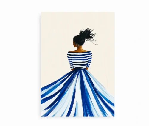 Kjolens lange, flagrende skørter og klassiske striber er gengivet med dynamiske penselstrøg og kontrasterende nuancer af blå, som giver bevægelse og liv til motivet. Den lyse baggrund skaber ro og lader kvinden stå i centrum uden forstyrrelser. Det gør plakaten ideel til dig, der elsker enkel, men udtryksfuld kunst.