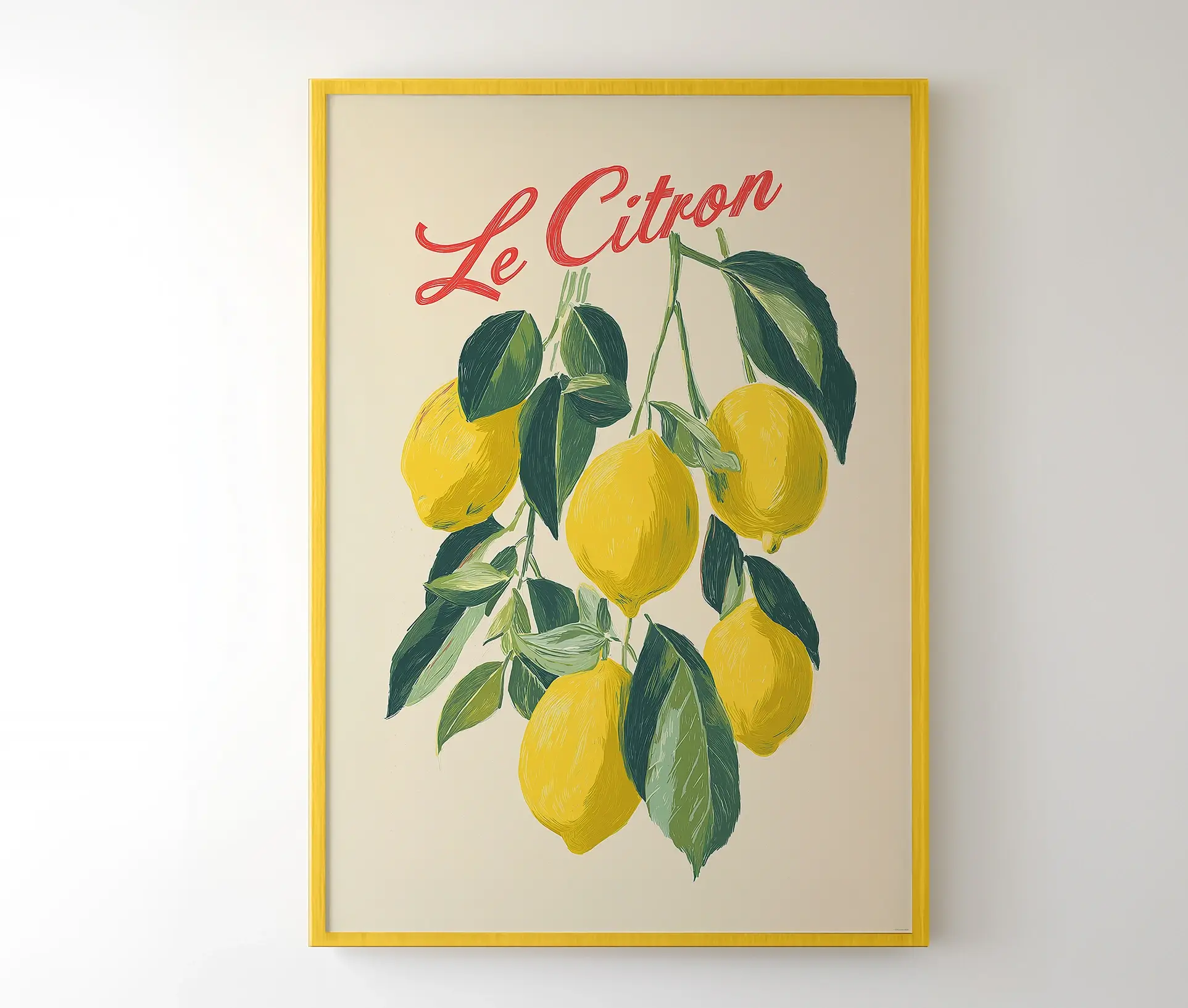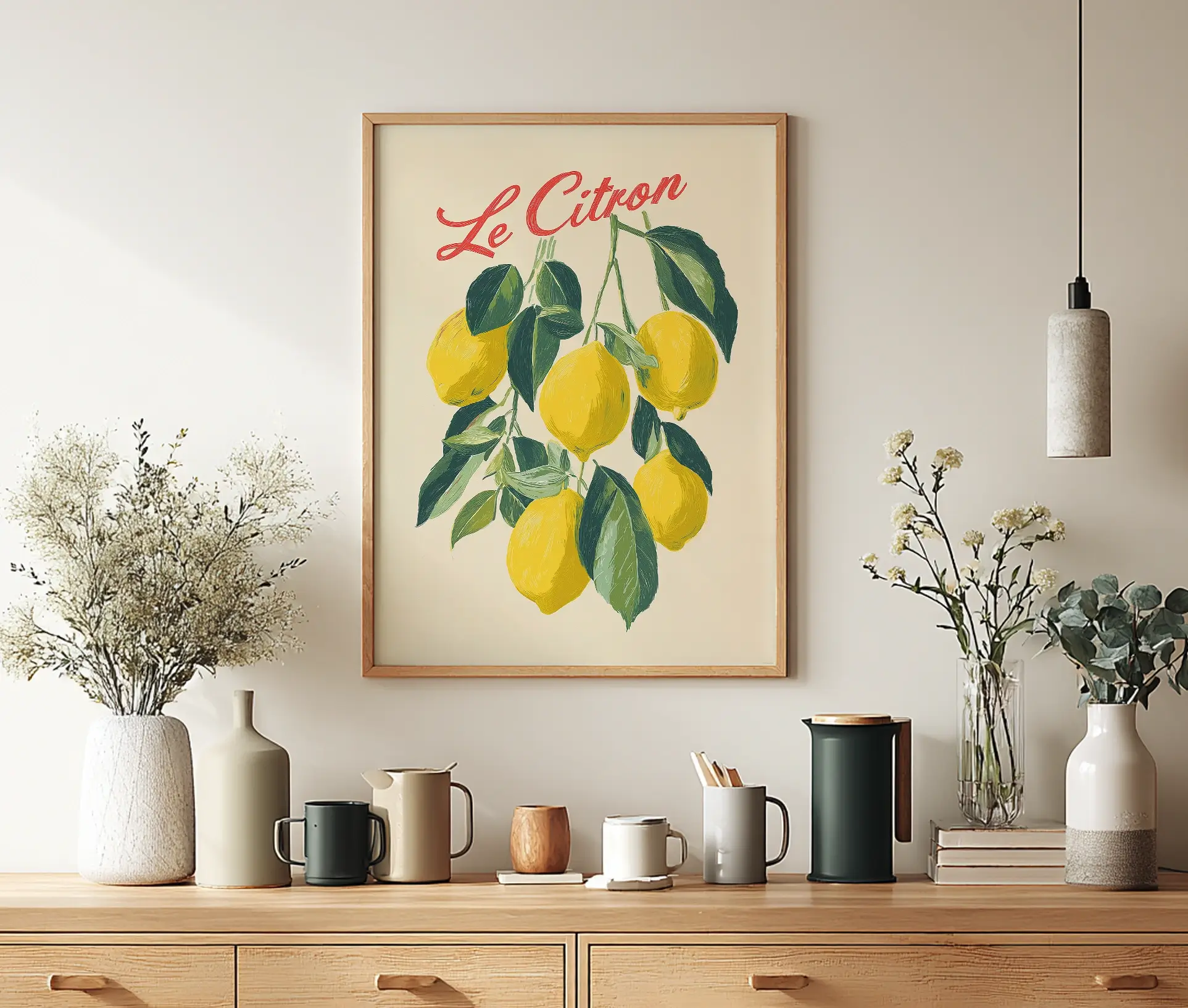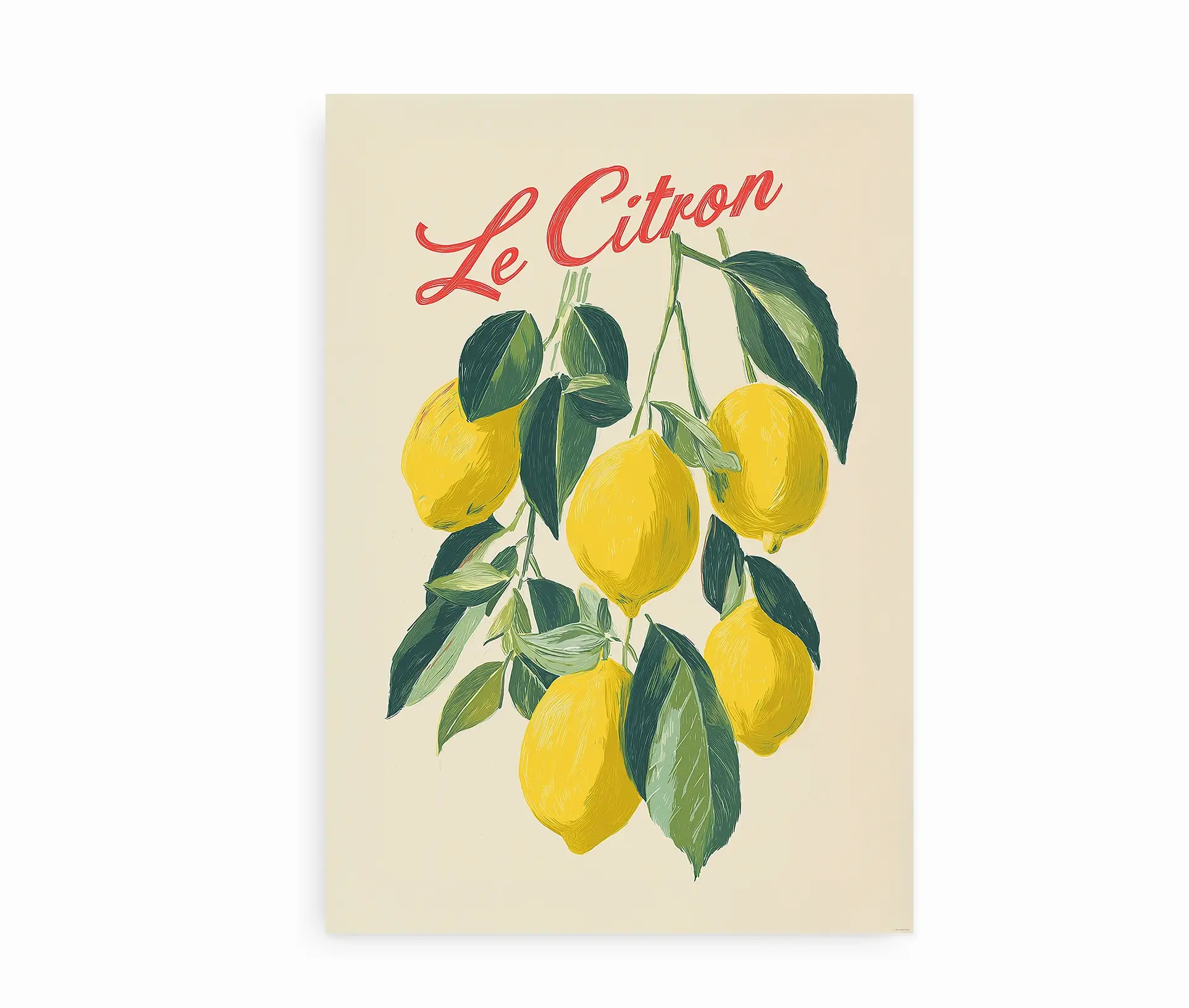 Teksten “Le Citron” i rød håndskrevet stil giver plakaten et autentisk fransk præg og tilføjer karakter uden at tage fokus fra motivets naturlige elegance. Denne plakat er et oplagt valg for dig, der elsker køkkenkunst, botaniske elementer. Eller bare ønsker at tilføje lidt liv og farve til væggen.