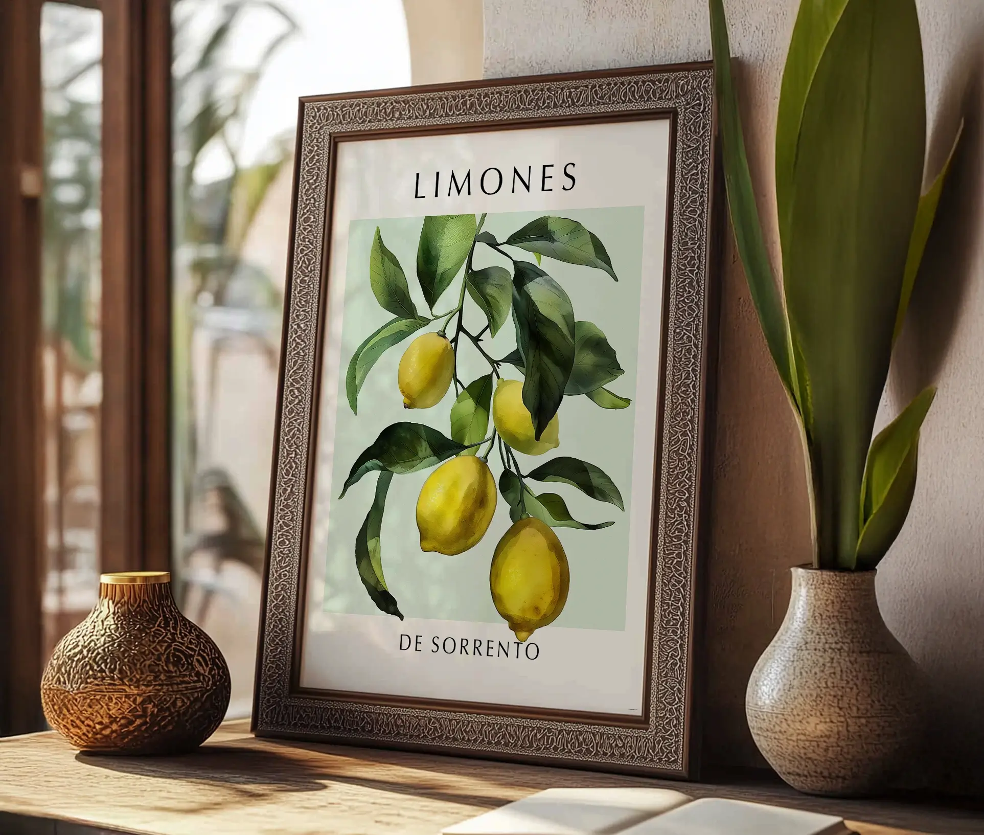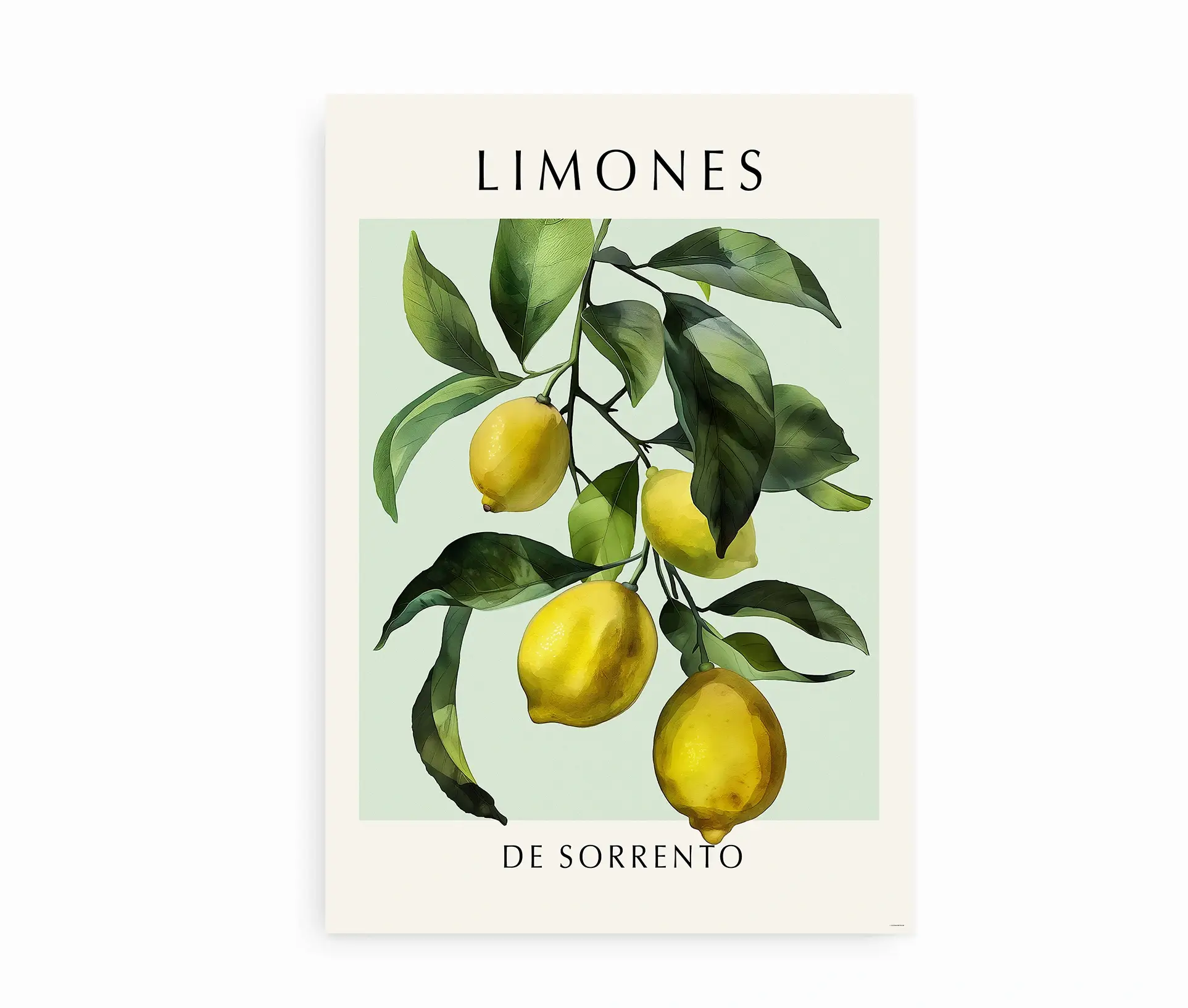 Bring en smag af Middelhavet ind i dit hjem med denne smukke plakat, “Limones de Sorrento”. Den illustrerer en gren fyldt med solmodne citroner og friske grønne blade mod en blød pastelgrøn baggrund. Inspireret af de berømte citronlunde i Sorrento, Italien, tilfører denne plakat en forfriskende og elegant atmosfære til din indretning.