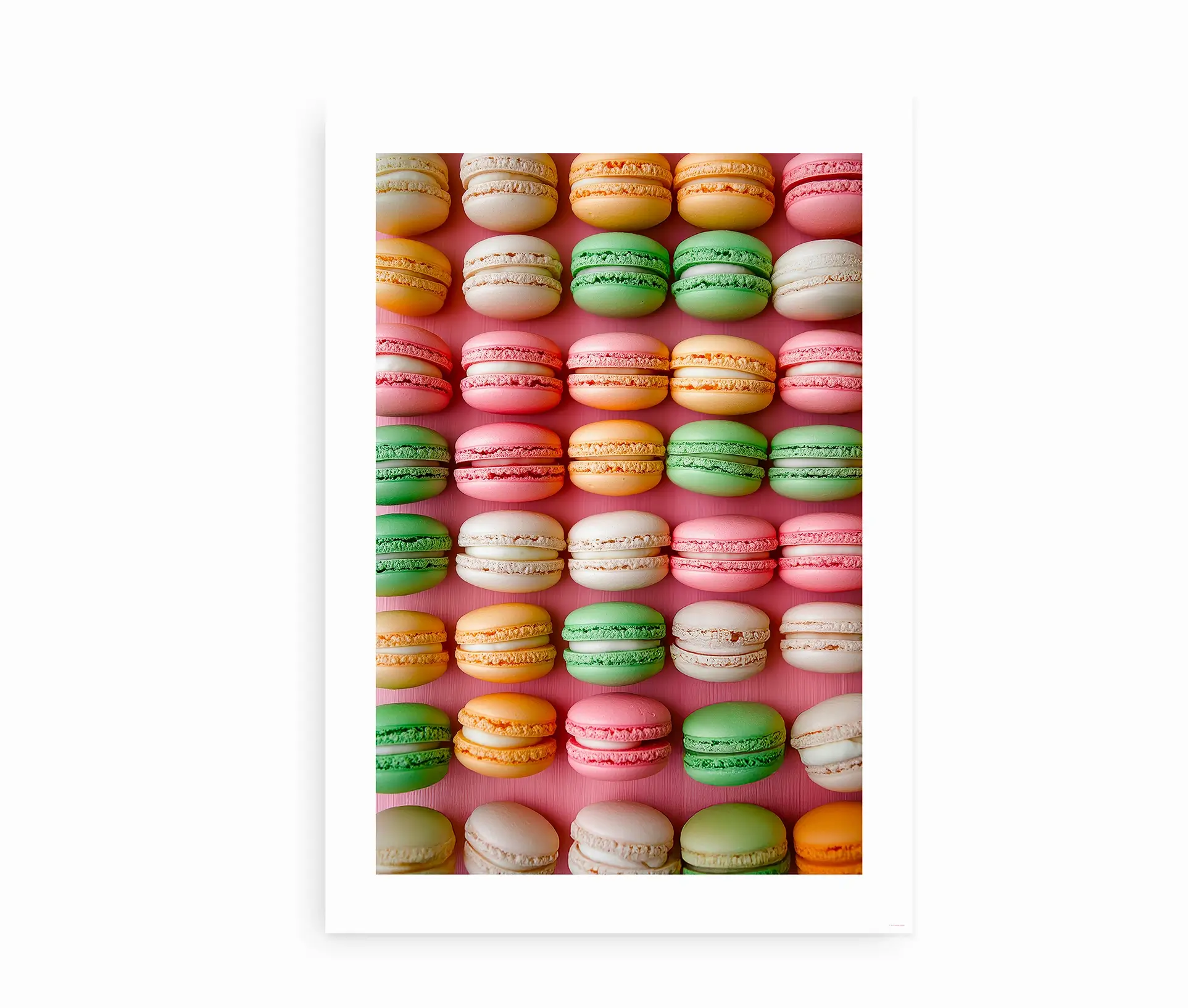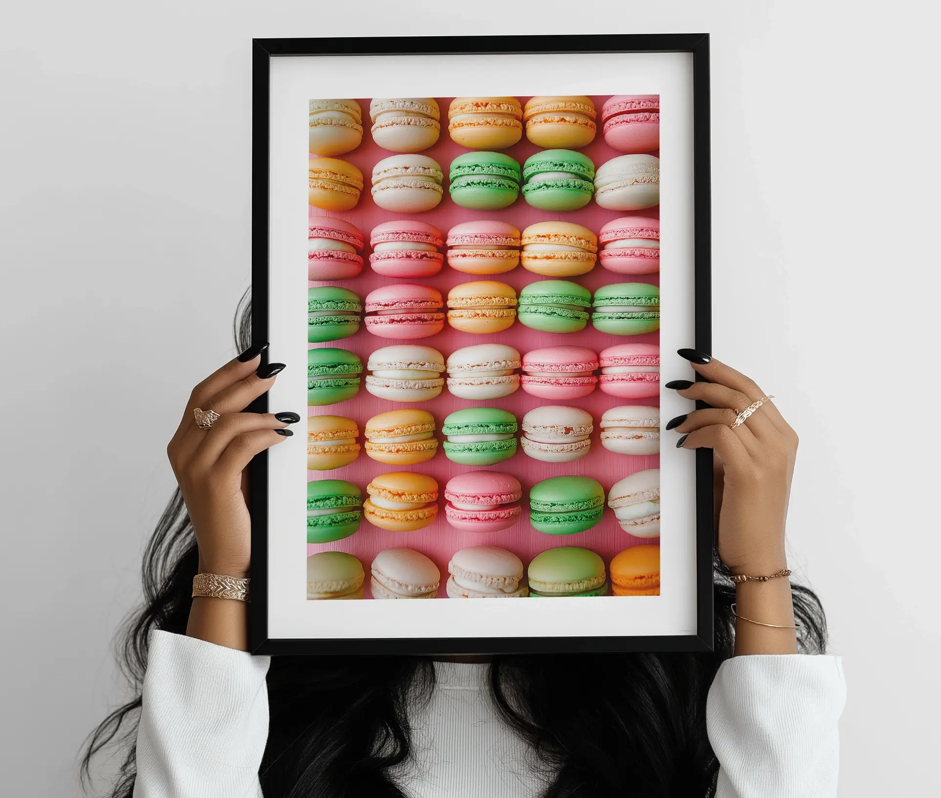 Denne plakat med farverige macarons er et festfyrværkeri af livlige nuancer og delikate detaljer, der giver ethvert rum et strejf af elegance og sødme. Med en perfekt arrangeret række af makroner i nuancer af pink, grøn, gul, hvid og orange skaber denne plakat en harmonisk og appetitvækkende visuel oplevelse. Detaljerne i hver enkelt makron er fremhævet med præcision, fra den sprøde skal til den cremede fyldning, hvilket giver plakaten et realistisk og næsten sanseligt udtryk.