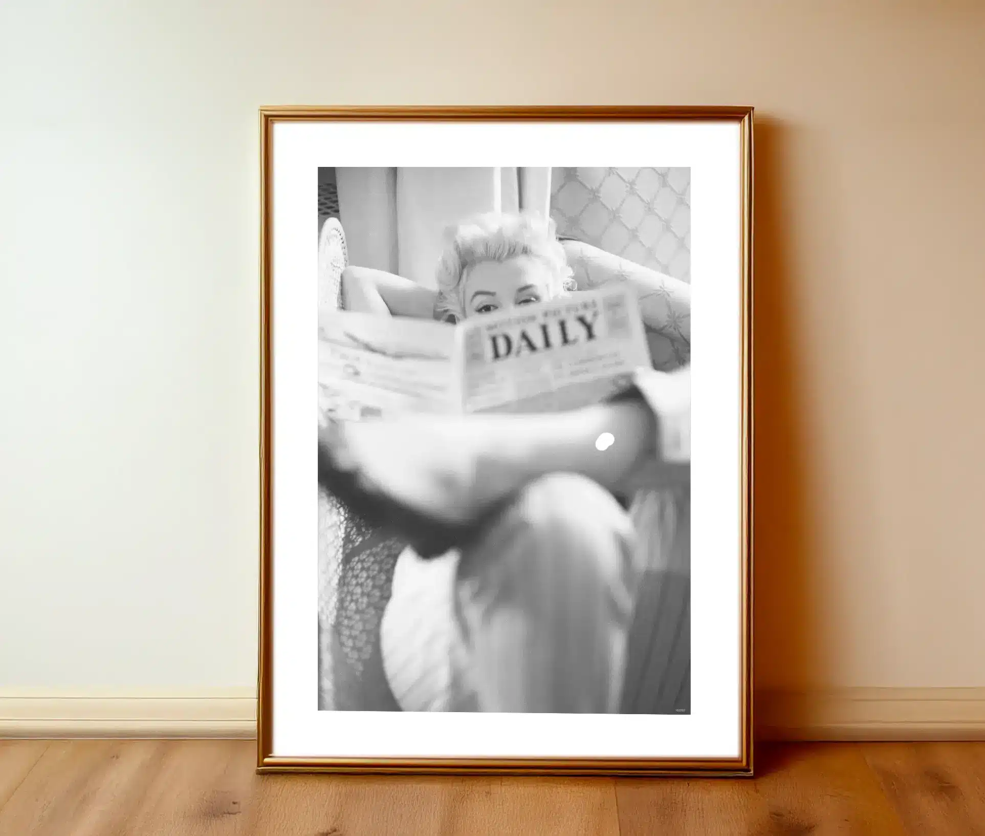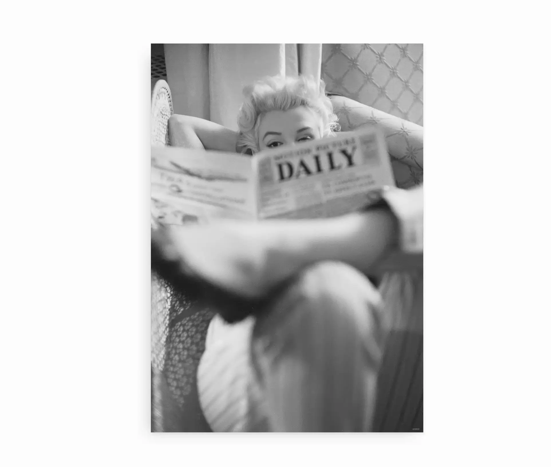 Denne stemningsfulde sort-hvid plakat indfanger den legendariske Marilyn Monroe. I et sjældent og afslappet øjeblik, sidder hun komfortabelt tilbagelænet og læser avis. Hendes blik, som kigger netop over avisen, er både dragende og fuld af personlighed. Motivet er både intimt og ikonisk, og viser en mere underspillet, men stadig glamourøs side af Monroe, som sjældent er set.